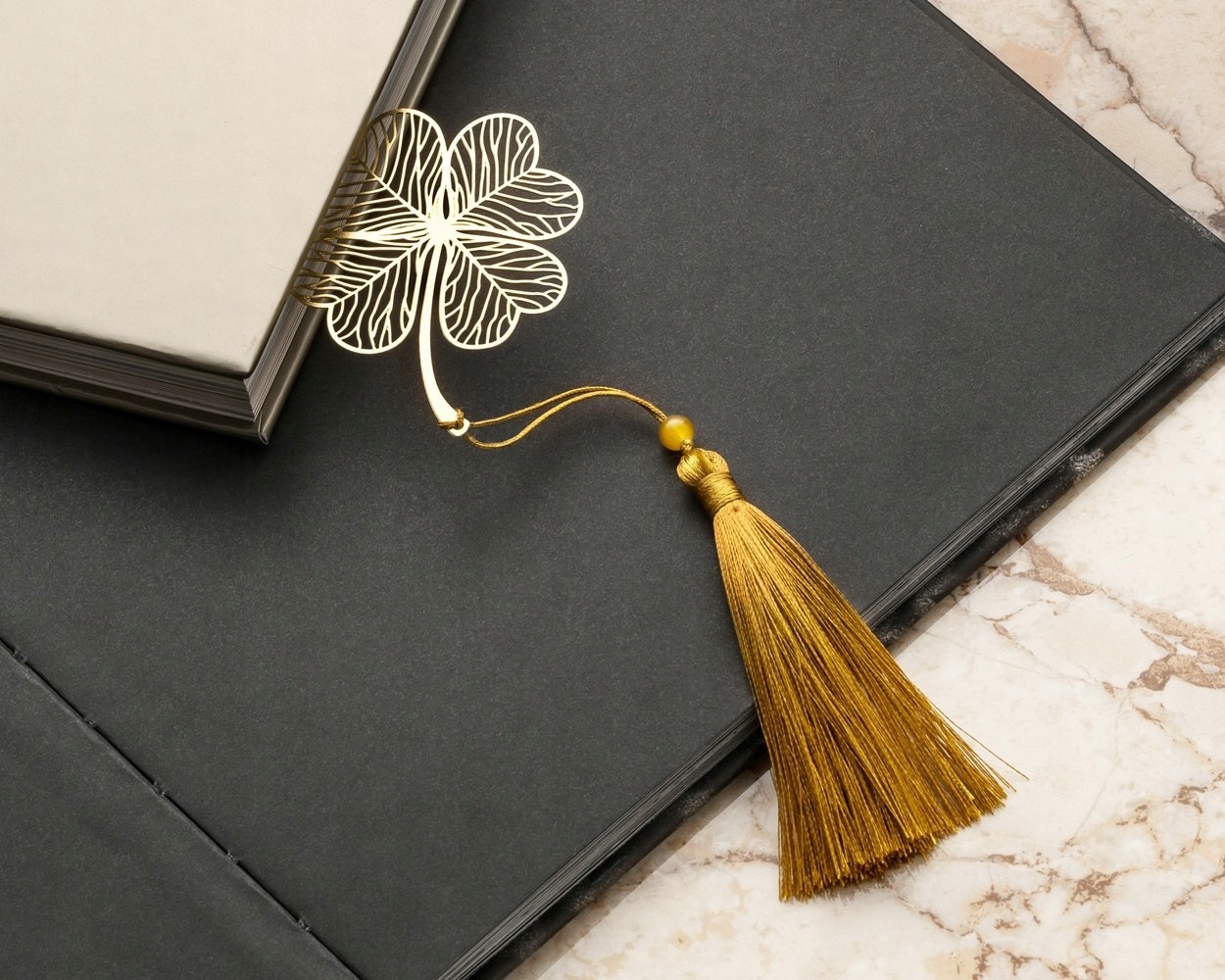 Металлическая закладка в виде клеверного листа.
