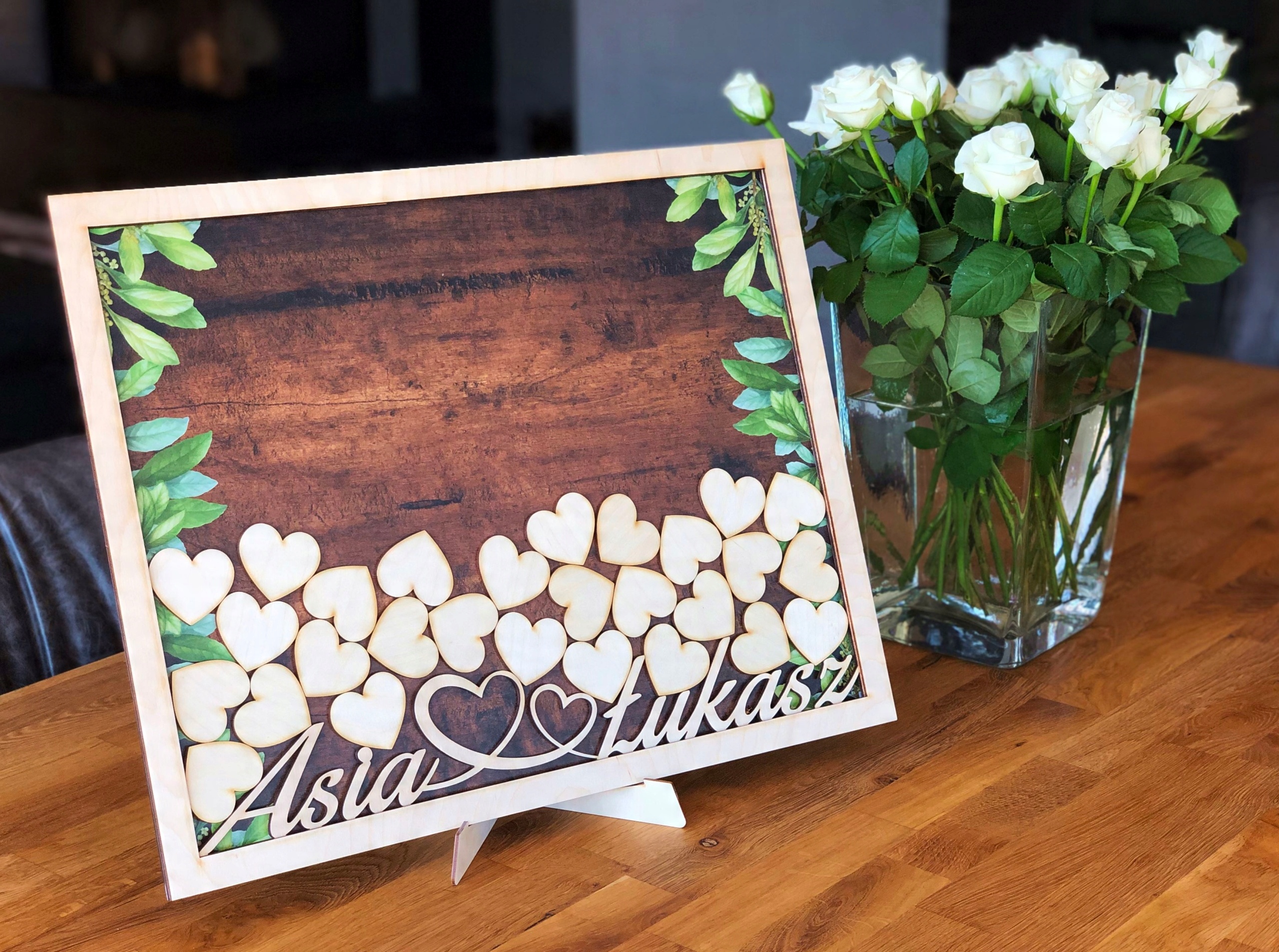 - деревянная гостевая книга + гравировка + сердечки для вставки