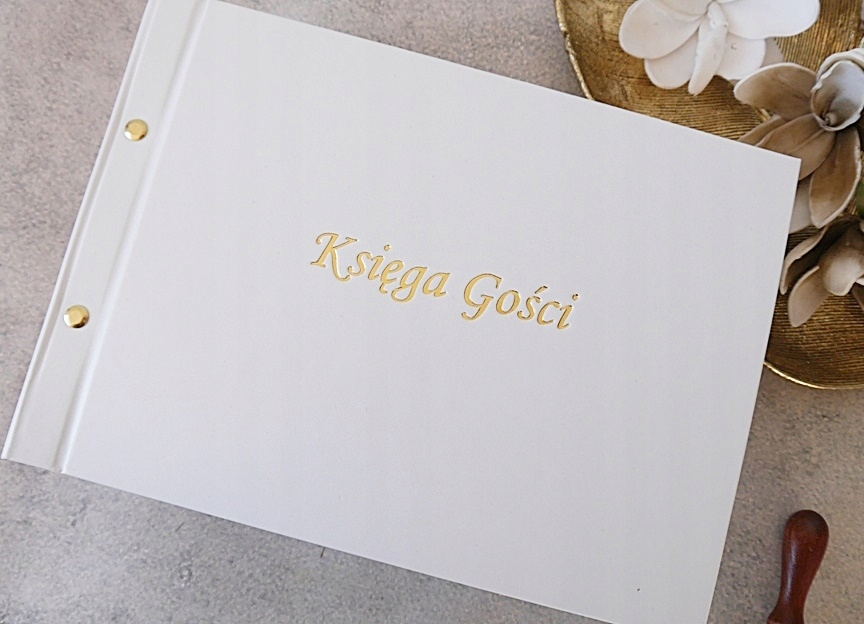 - Белый кожаный переплет, золотая надпись на лицевой стороне Гостевая книга.