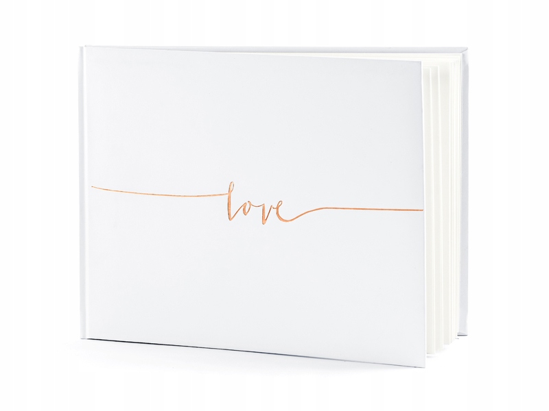Гостевая книга в переплете на бумаге кремового цвета, с надписью Love в розовом золоте. Книга выглядит шикарно.