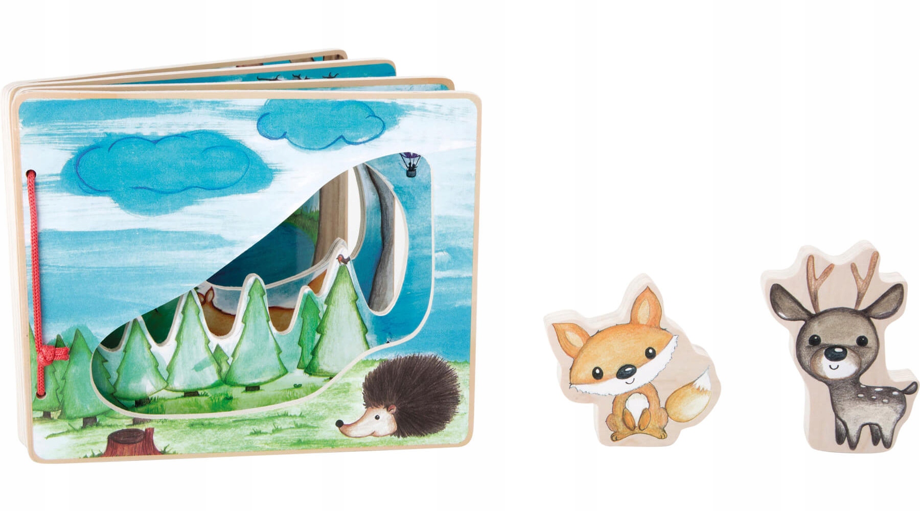 4 страницы книги, выполненные из сертифицированного дерева, перевязаны красной веревочкой. Они имеют отверстия различной формы, через которые могут пройти лисы и олени. Оба зверя прикреплены на последней странице на липучке, чтобы они не потерялись и вернулись на свое место после игры.