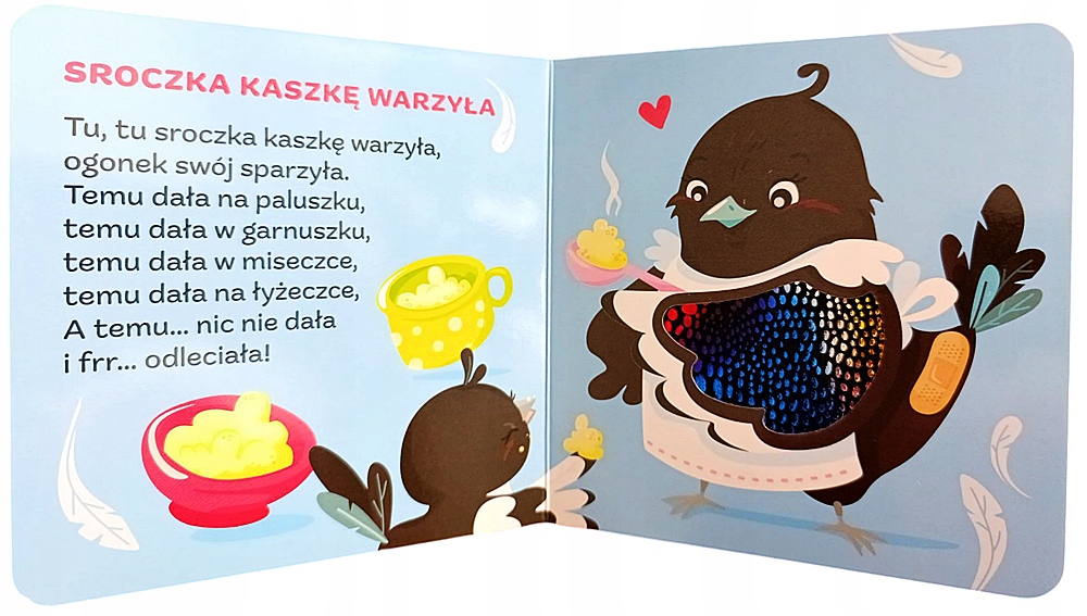 - буклет представляет хорошо известные и любимые стихи, такие как «каша Sroczka», в компании Nice Illustrations и тщательно выбранных сенсорных материалов.