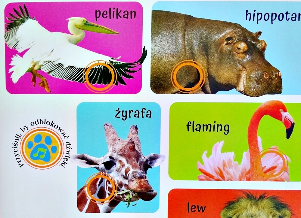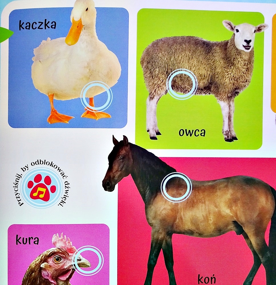 - Чтобы книга познакомила вас с миром разнообразных звуковнужно нажать лапой на отмеченное поле, чтобы разблокировать звуки на странице. >