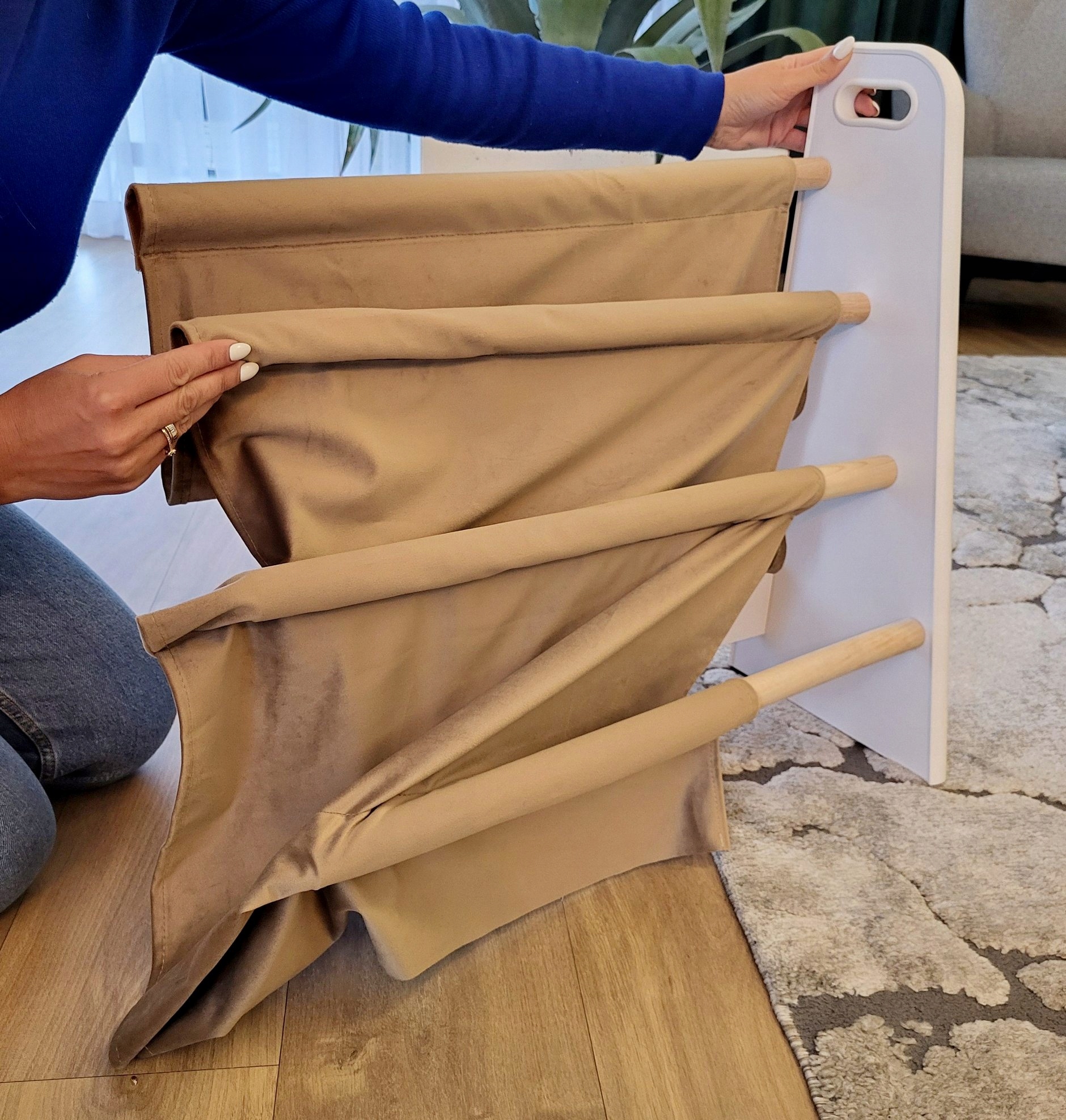 Книжная полка изготовлена из высококачественного ламината, обладающего антибактериальными свойствами, и брусков из натурального бука, которые идеально полируются. На перекладинах подвешен качественный бархатный материал с тонкими аппликациями - 3 звезды.