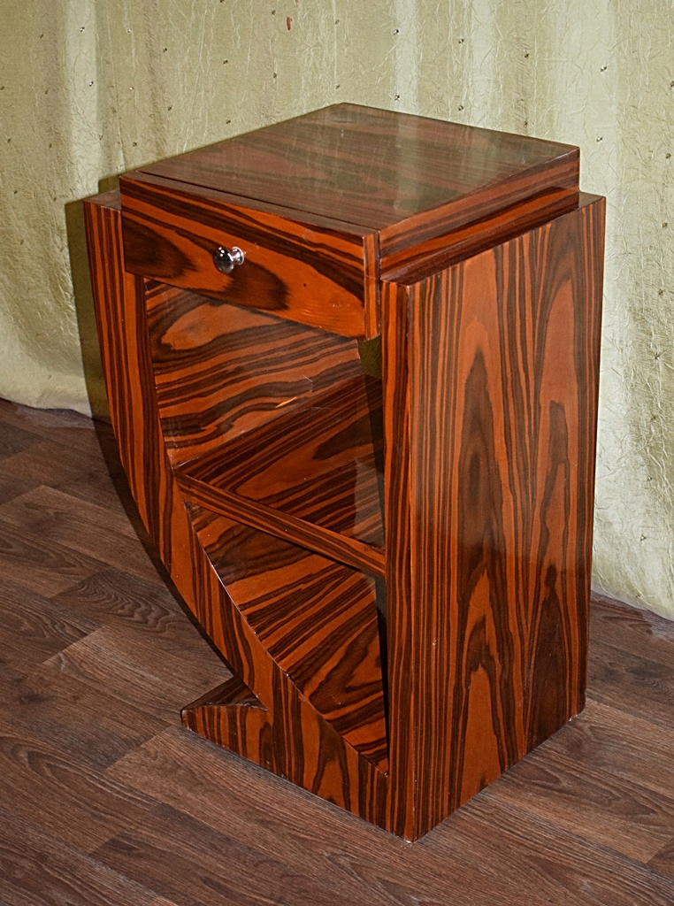 Мебель выполнена в современном, старинном стиле, сохраняя все формы, характерные для ар-деко. Материал – 100% древесина цвета ореха с фантастическим оригинальным рисунком натуральной текстуры. Комплект состоит из трех комодов, каждый с одним ящиком и полкой под ним. Рисунок мебели не повторяется, шкафы можно использовать как в комплекте, так и по отдельности.