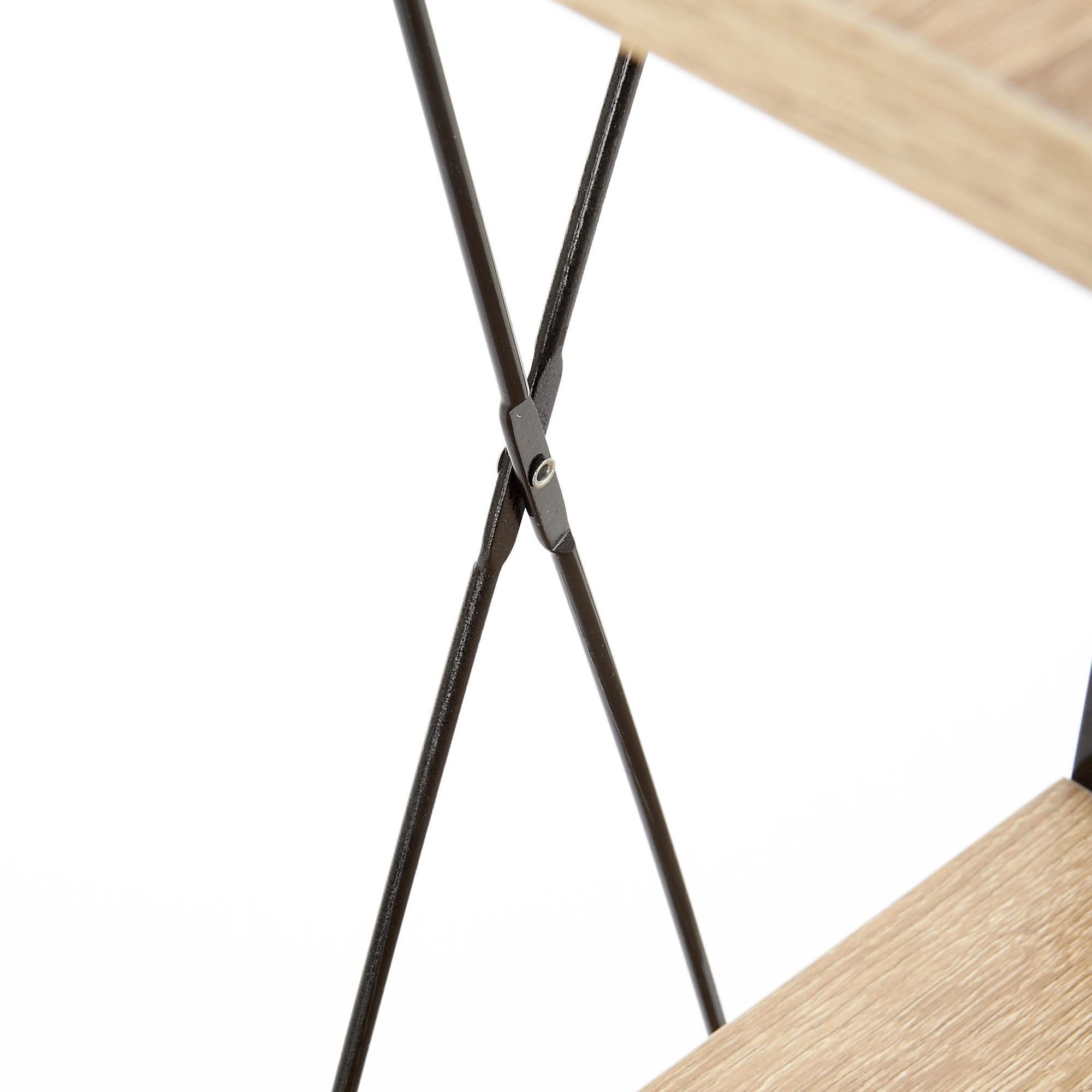 Минималистичная, простая полка с контрастной рамой и четырьмя полками оттенка дуба Сонома. Хоть сама полка и не занимает много места, она очень вместительная и функциональная. Каркас из крашеной стали, столешница – ламинат. Благодаря своей универсальной форме мебель хорошо подойдет для гостиной, студенческой комнаты или кабинета.