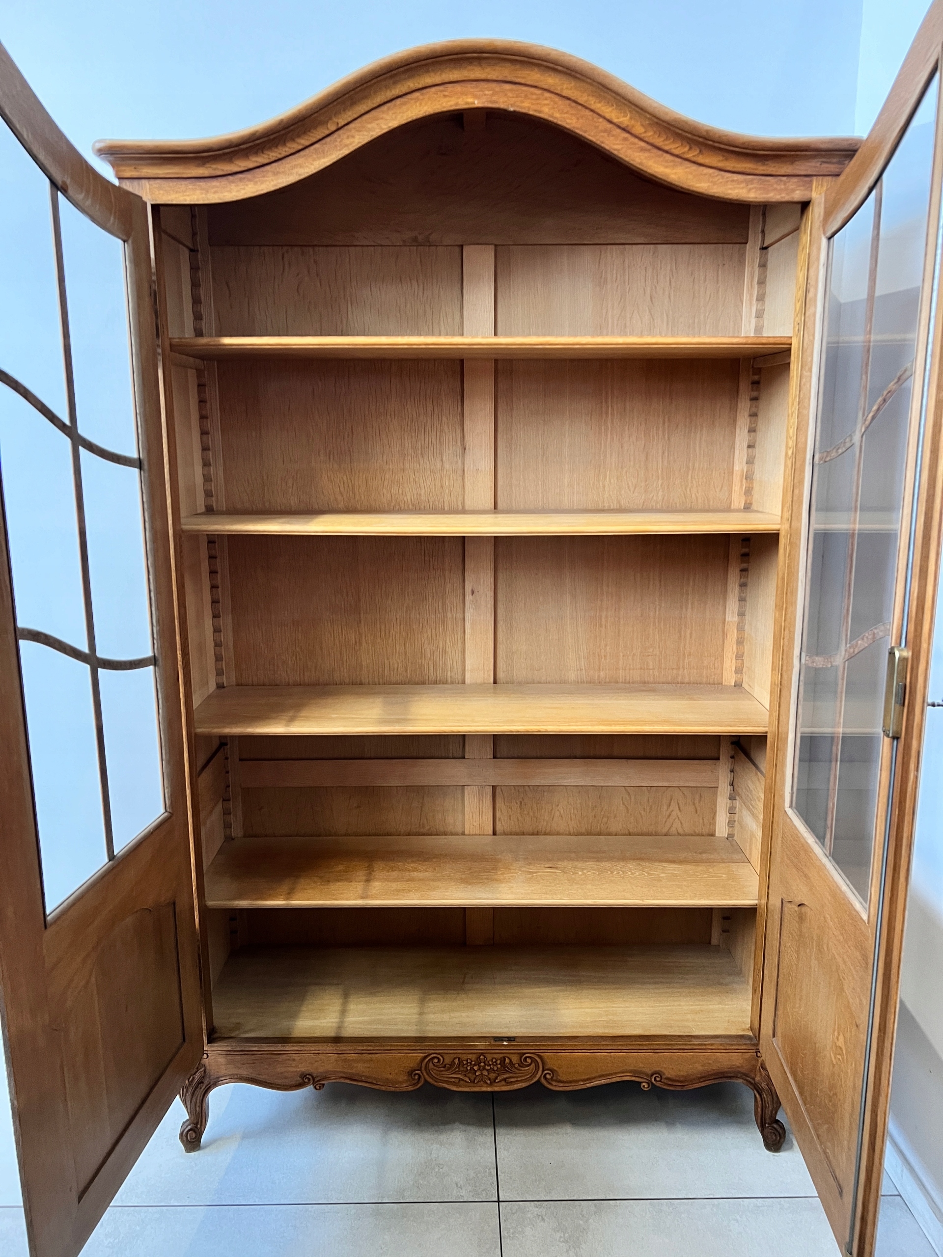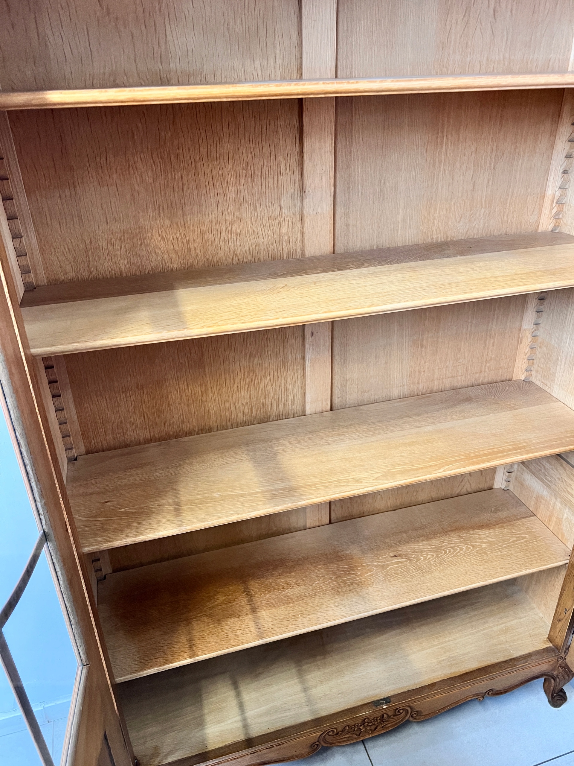 Двухдверный книжный шкаф, выполненный в стиле Людвик. Очень хорошенькая. Он находится в хорошем состоянии. Имеет типичные следы использования. В принципе, кроме царапин на двери, других недостатков нет. Она хорошо сохранилась. Замок функциональный, в комплекте есть ключ. Внутри четыре полки, высоту которых можно свободно регулировать. Книжный шкаф не складной. Он готов к вставке.