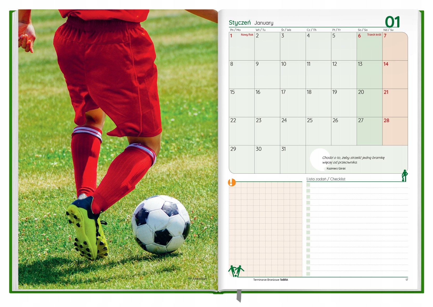 Календарь в формате B5, макет недели и пометки на развороте. Все это дополняется интересными, мотивирующими футбольными фотографиями.
