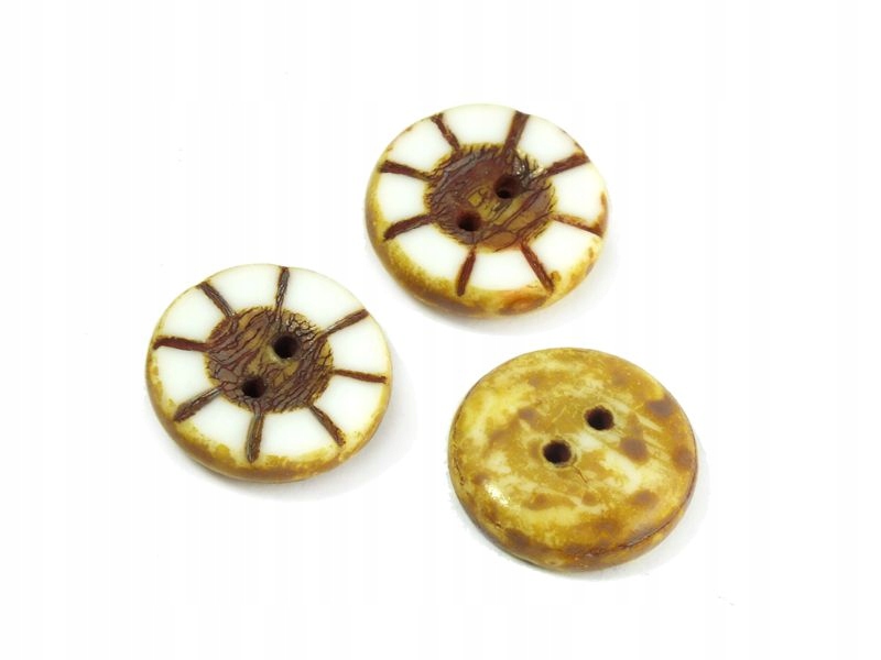 Очень эффектные чешские стеклянные бусины столовой огранки – пуговицы с двумя отверстиями диаметром ок. 14 мм и толщиной ок. 5 мм, диаметр отверстий ок. 1 мм. Белый, непрозрачный, покрыт коричневыми пятнами, а затем отполирован сверху, благодаря чему из-под покрытия виден первоначальный цвет бусины. Из-за технологии производства бусины отличаются и имеют слегка неровную форму.