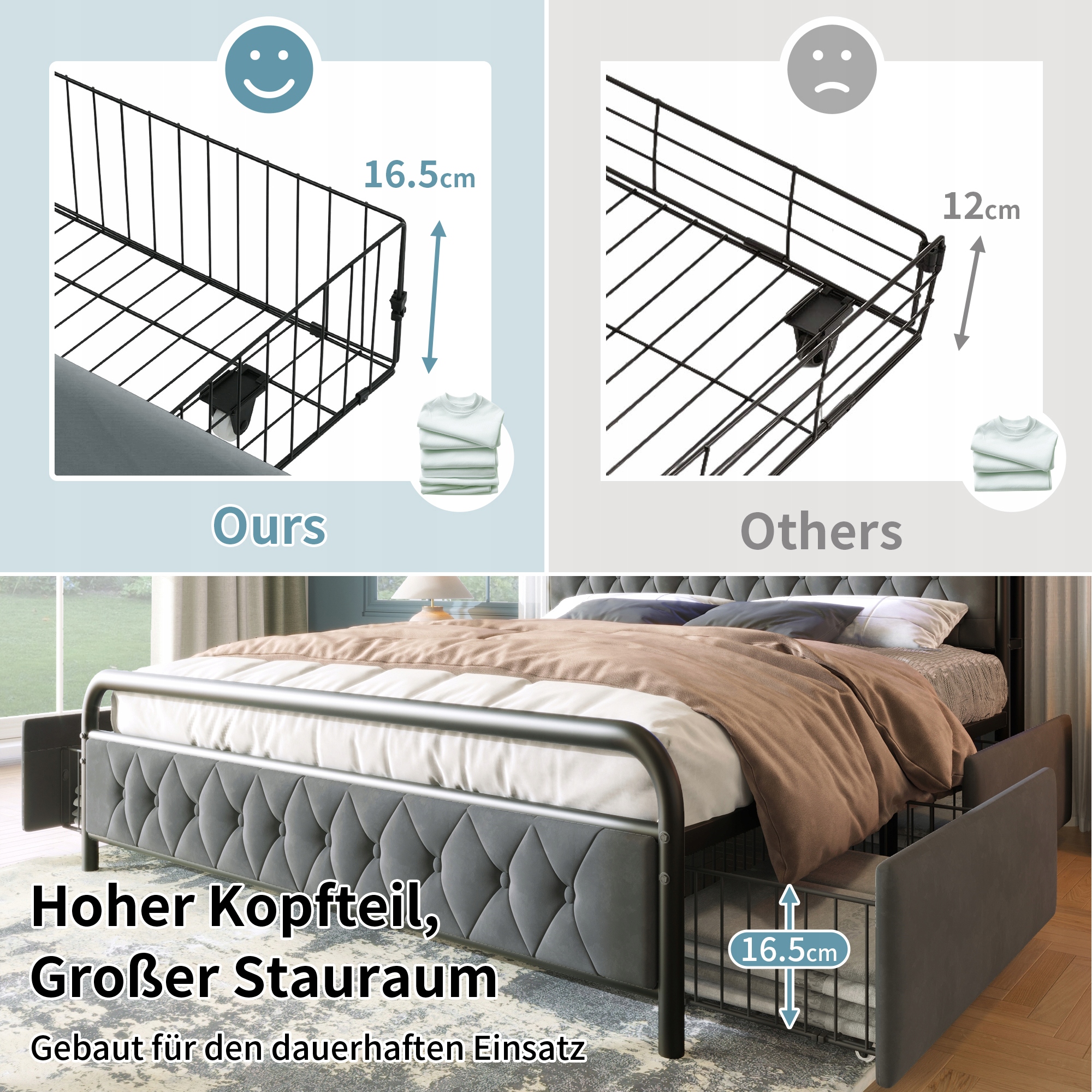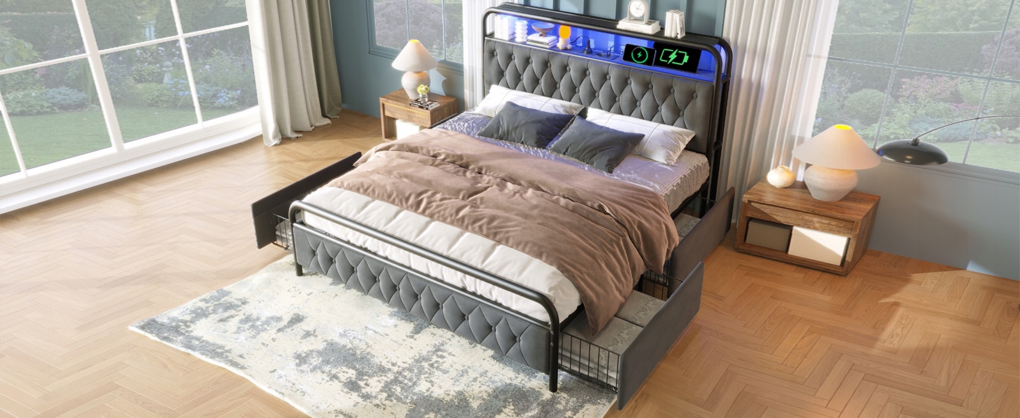 Łóżko podwójne tapicerowane 140×200, USB typu C i 4 szuflady (bez materaca)