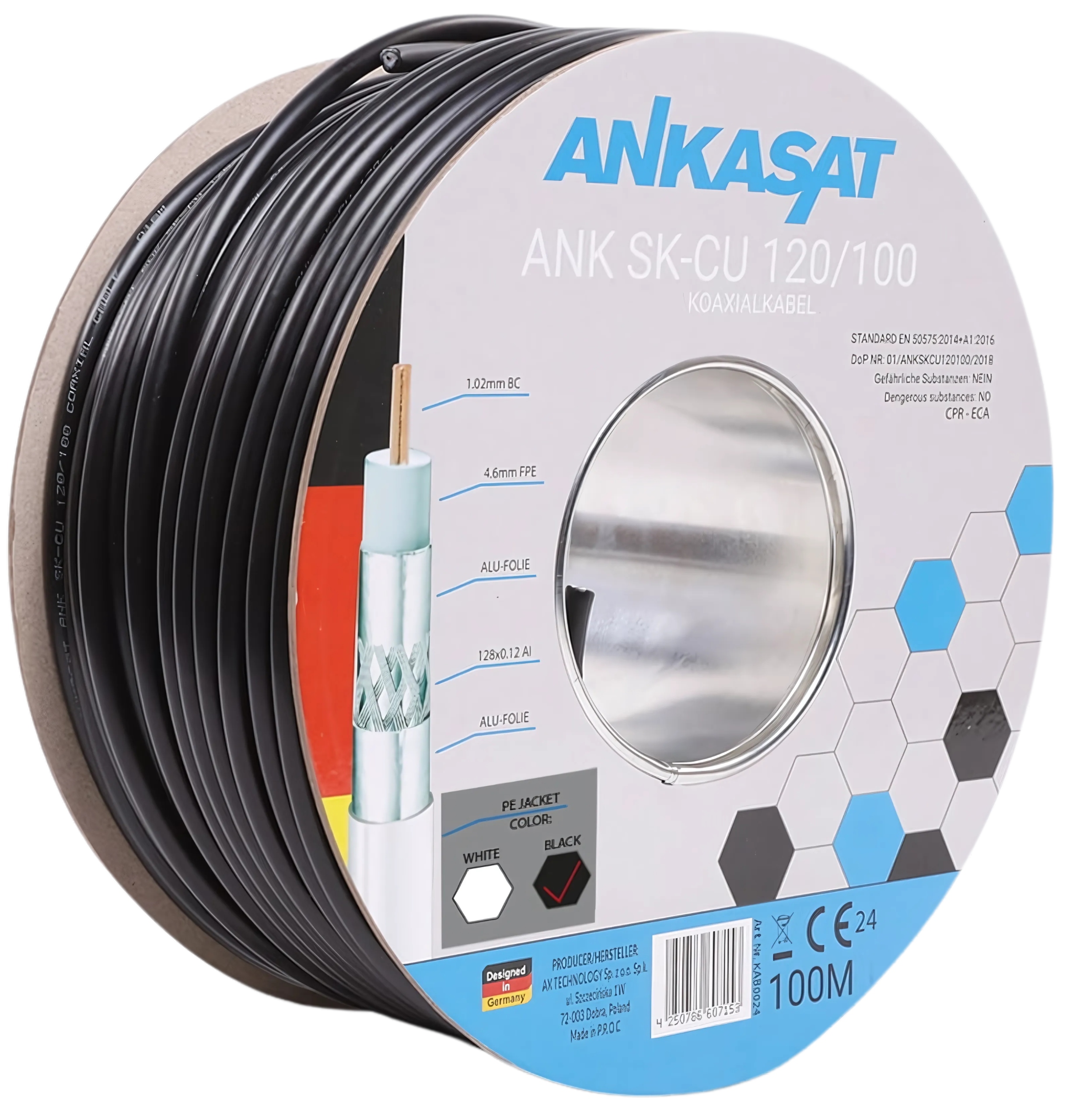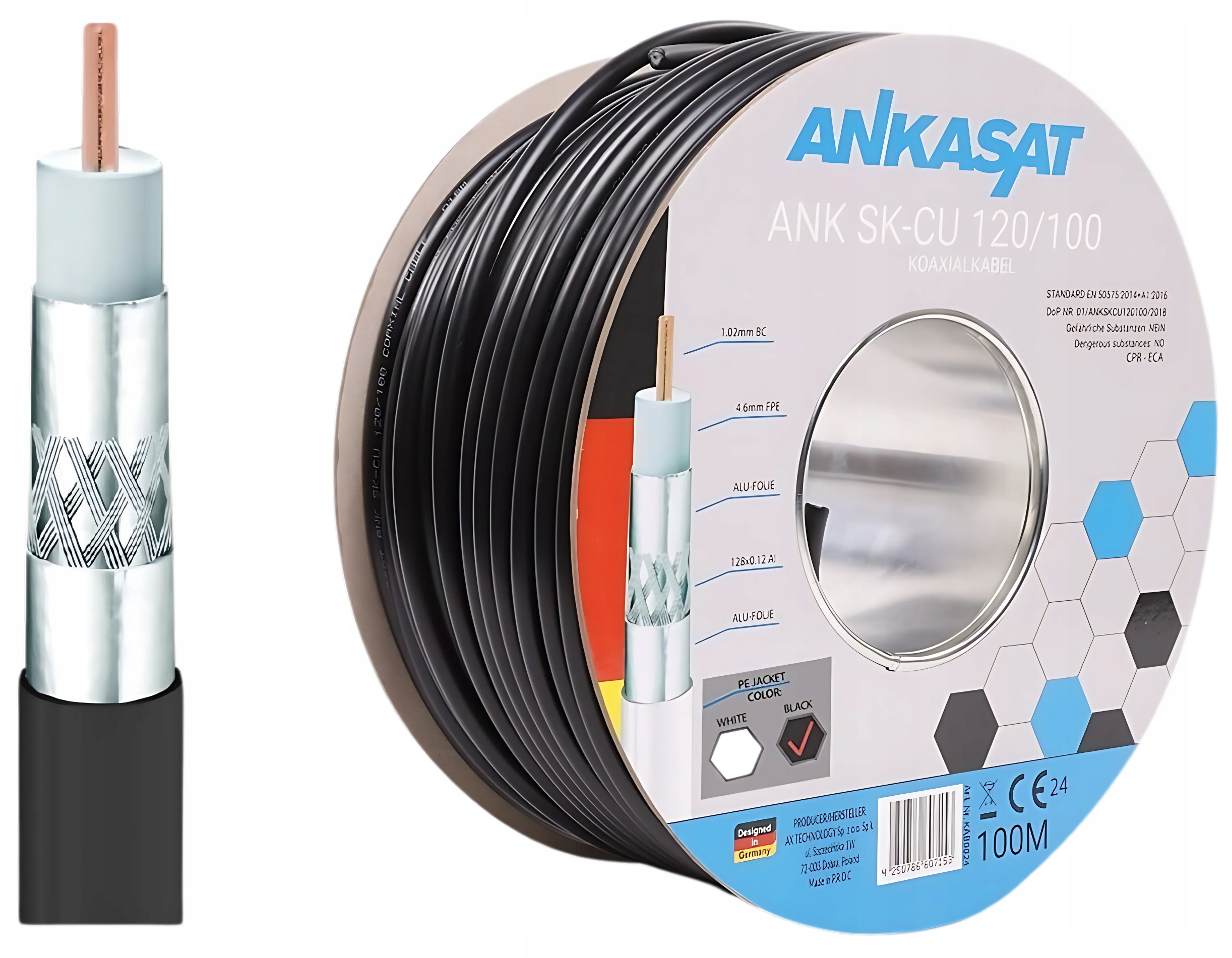 Коаксиальный кабель ANK SK-CU 120/100 CPR-ECA — это продукт премиум-класса для требовательных монтажников и пользователей. Благодаря тройному экранированию, высокой эффективности изоляции сигнала и устойчивости к внешним факторам он идеально подходит для антенных, мультикоммутационных и кабельных установок.