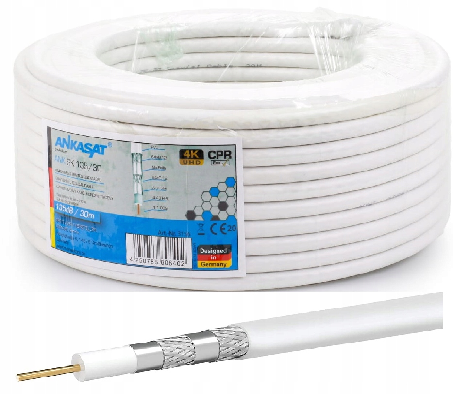 Коаксиальный кабель от известной немецкой компании ANKARO . Это один из лучших коаксиальных кабелей в своем классе, рекомендуемый для установки спутникового, кабельного и коллективного телевидения, а также внешних и внутренних эфирных антенн. Кабель Ankasat ANK SK 135 в виде 30-метрового рулона.