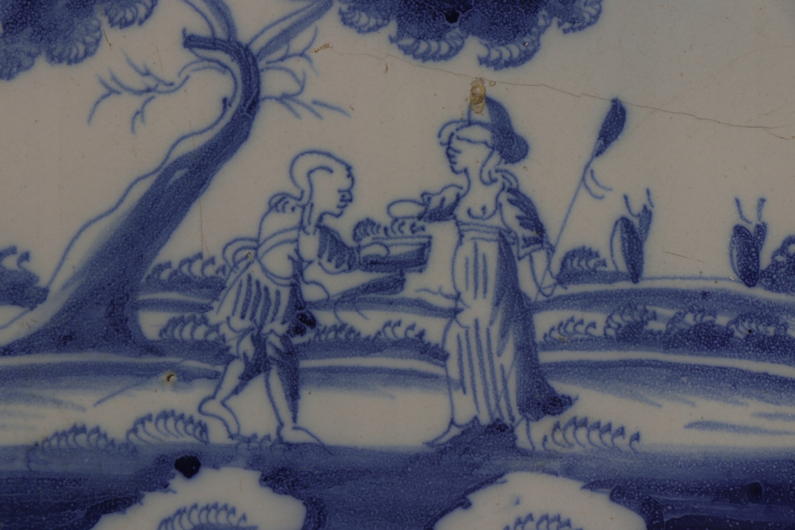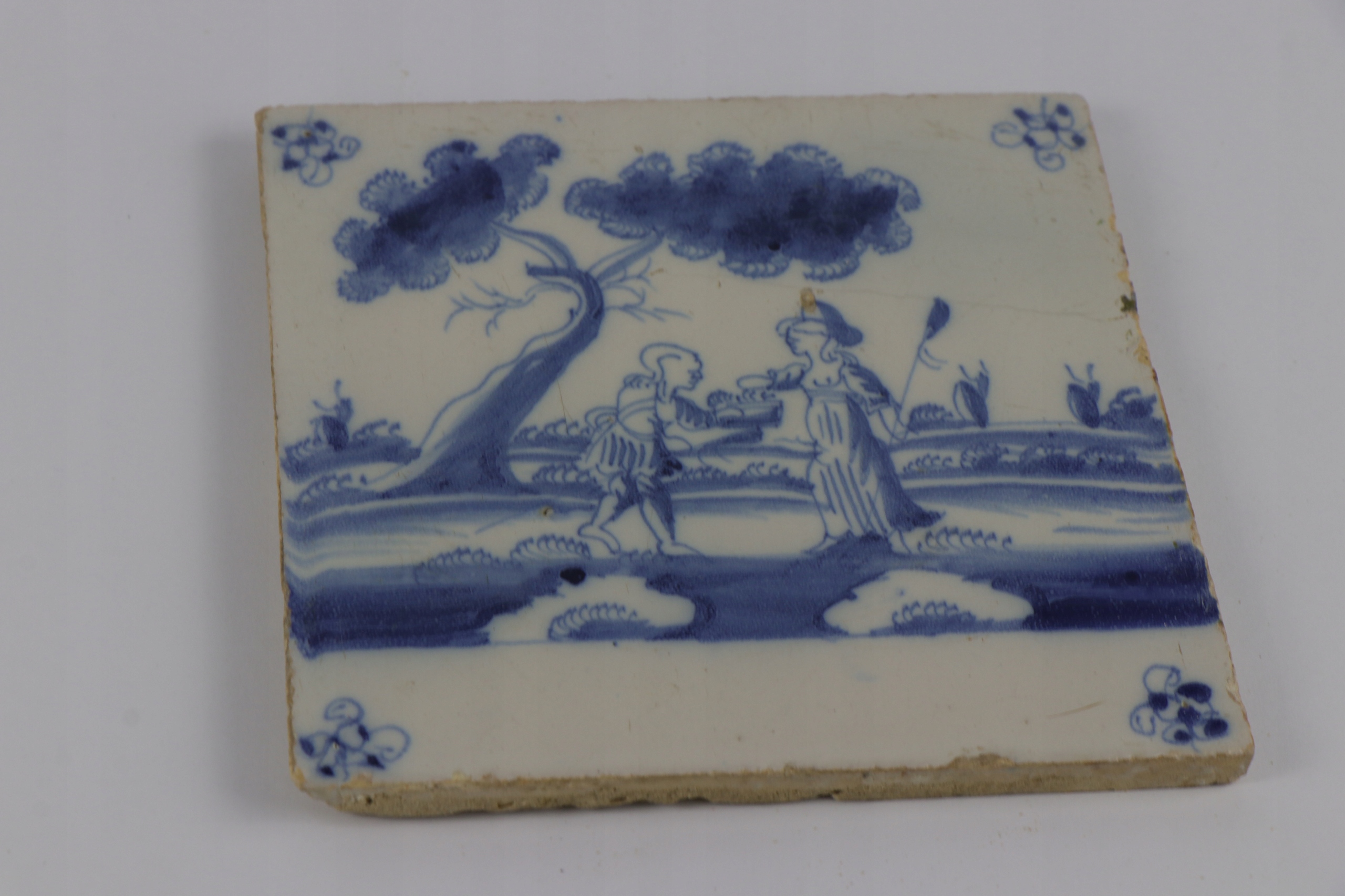 Кобальтовая плитка Delft, расписанная вручную. На плитке изображен орнамент жанровой сцены. Предлагаю другие похожие плитки на другом аукционе.