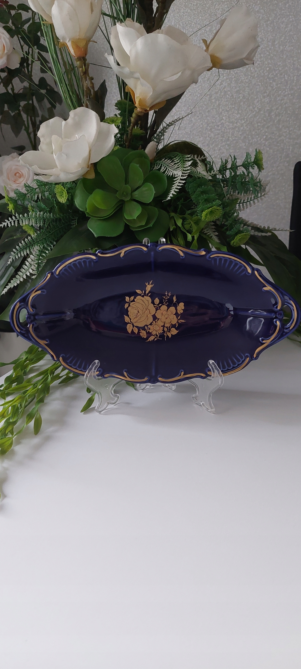 Кобальтово-синяя тарелка в очень хорошем состоянии, размеры: высота 3см, длина 30см, ширина 15см.