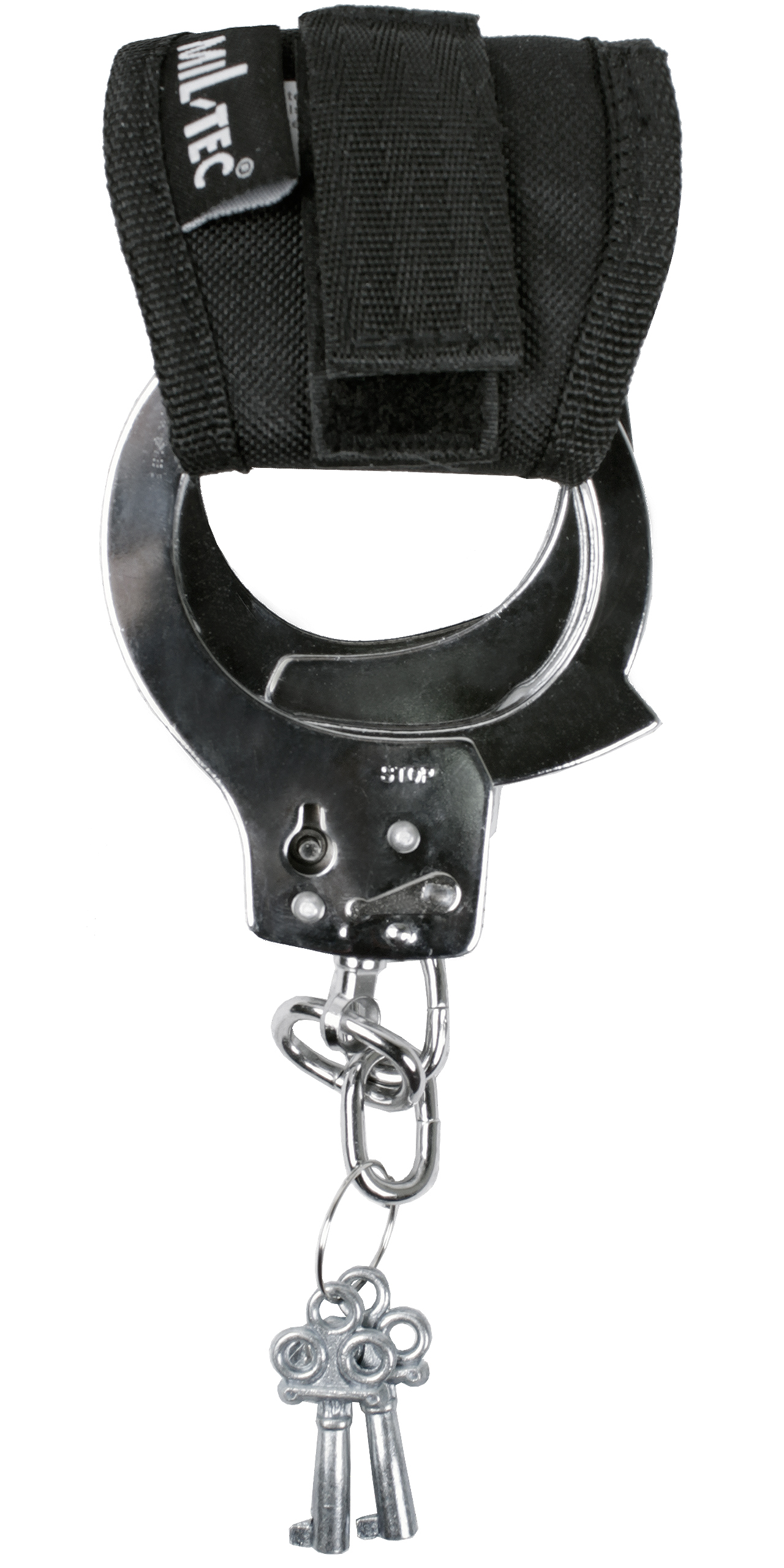 Сзади имеется ремешок, застегивающийся на липучке, который позволяет прикрепить наручники в чехле, например к поясу >, чтобы они всегда были под рукой.