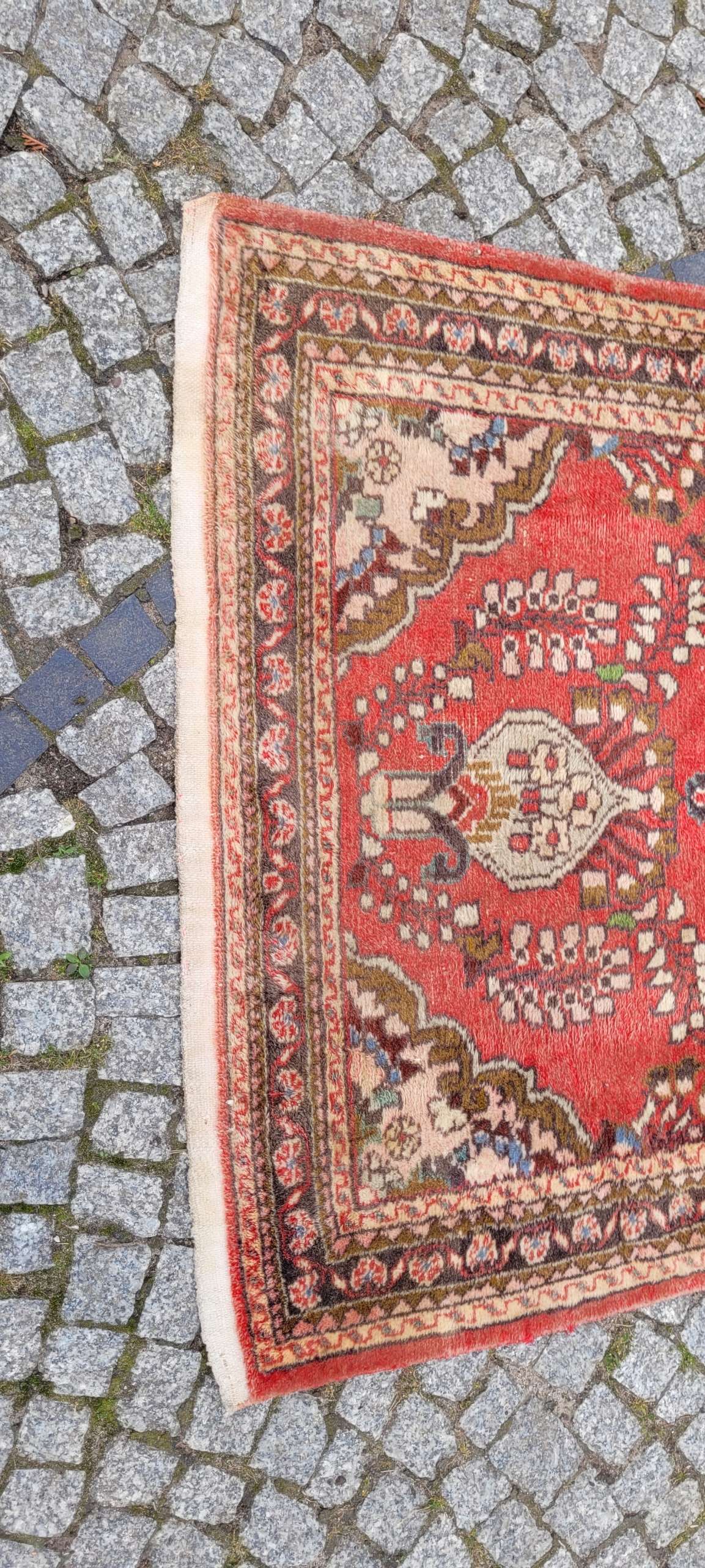 Персидский ковер Лилиан. Сплетен вручную из шерсти. Характеризуется компактным, приятным на ощупь, блестящим флисом и красивыми, истиранными цветами и узорами. Состояние хорошее, видно на фотографиях. Имеет патинированный флис и асимметрию.