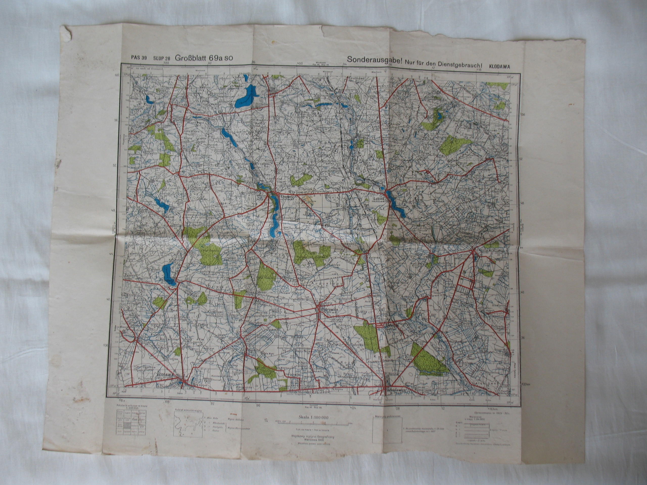 Старая оригинальная довоенная карта: Клодава и окрестности. Оригинал. Масштаб: 1:100 000. Карта фабрично сложена на 6 частей. Датировано: 1930 г. Размеры: 477 х 370 мм. Состояние: на мой взгляд -дб/+дст, грязь, перегибы и перегибы, повреждения, потери и надрывы по краям, все видно на сканах. Смело совершайте покупки.
