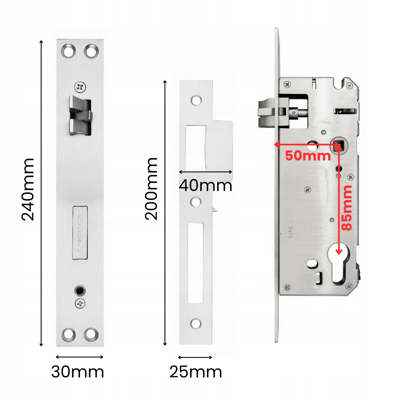 - Замок врезной: длина: 240 мм; ширина лицевой панели: 30 мм; глубина корпуса: 68 мм; расстояние: 50 мм