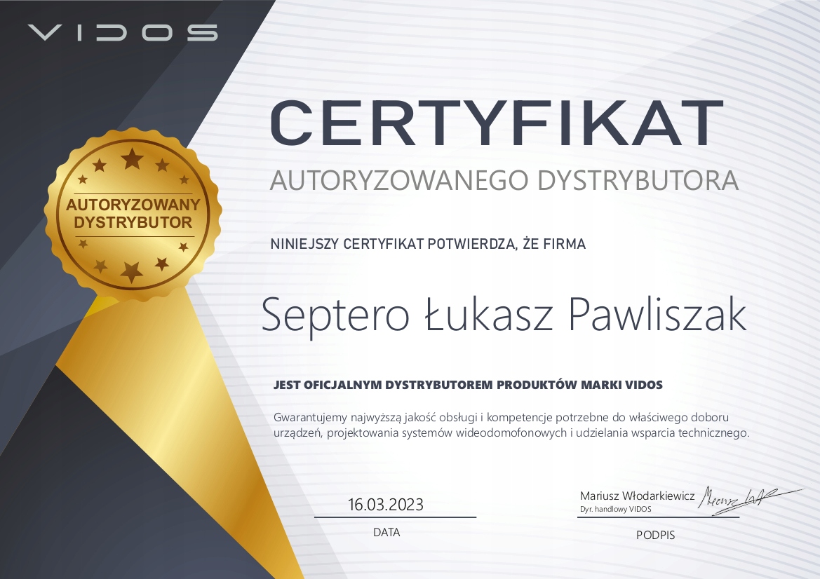 Мы являемся авторизованным дистрибьютором VIDOS, что дает Вам уверенность в том, что мы поставляем оригинальную и новую продукцию от официальной польской дистрибуции.