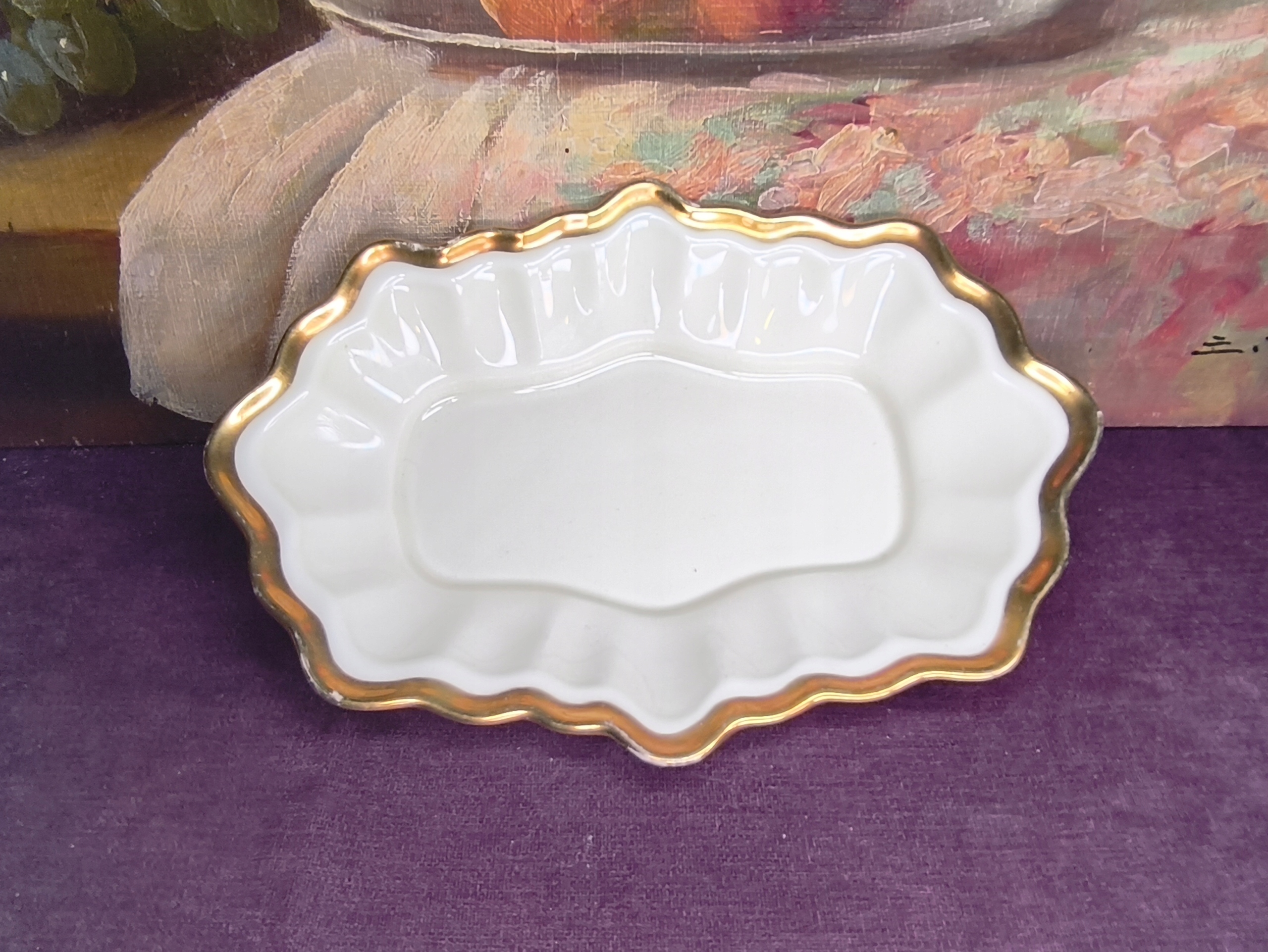 Фарфоровая тарелка фабрики Кенигзельт, ныне Явожина-Сленска, в стиле Шарлотты. Кремовый фарфор, украшенный широкой позолотой. Слегка приподнятые гофрированные края. По позолоте имеются небольшие потертости. Размеры тарелки 27х19 см, высота по краю 4,5 см. Я рекомендую. Также доступны полные кофейные и обеденные сервизы в стиле Шарлотты.