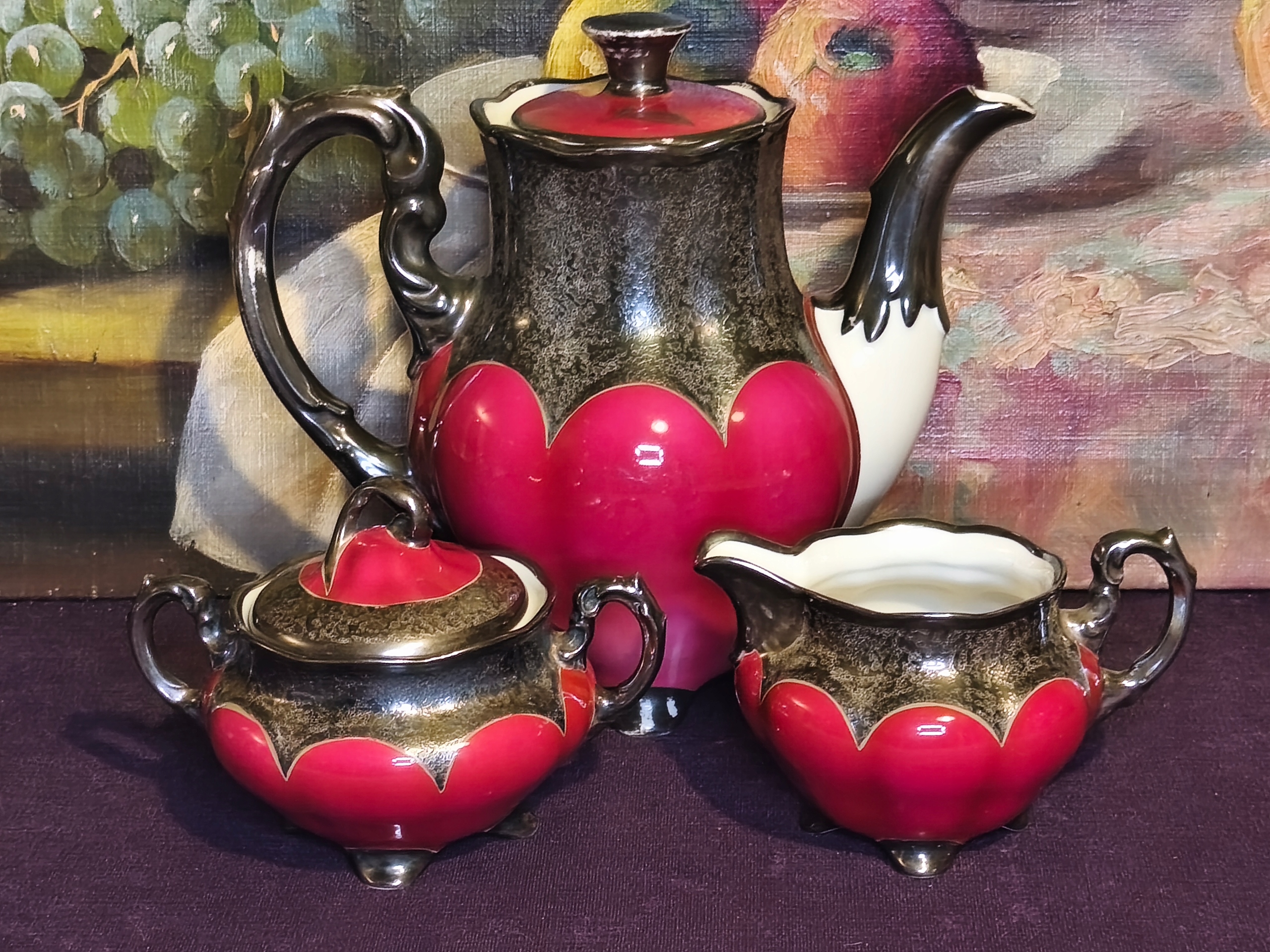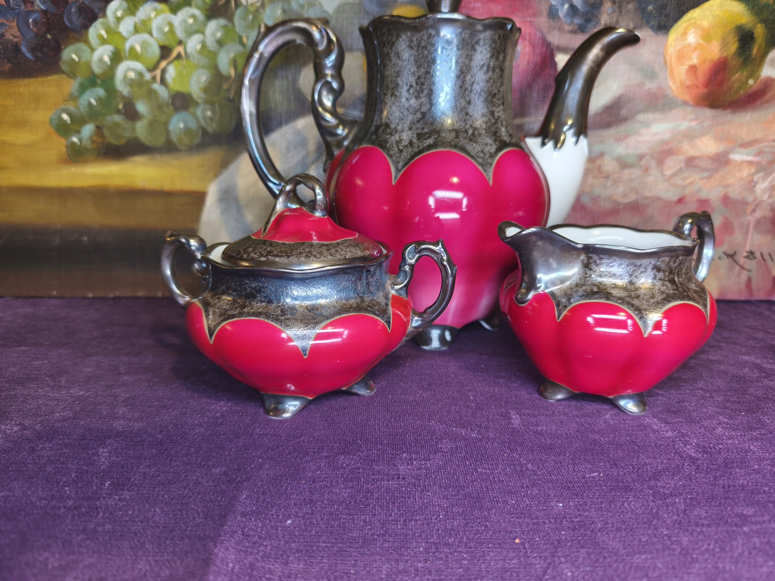 Коллекционный фарфор. Одна из самых известных фабрик Koenigszelt межвоенного периода, расположенная в Явожине-Сленской, престижный стиль Шарлотты с уникальным декором. Красивые цвета. У кувшина соответствующая крышка. Сахарница и молочник. Дефекты указаны на фотографиях, а именно скол возле ручки и на основании кувшина и потертости. Красивый коллекционный фарфор в практически уникальном декоре. Рекомендую.