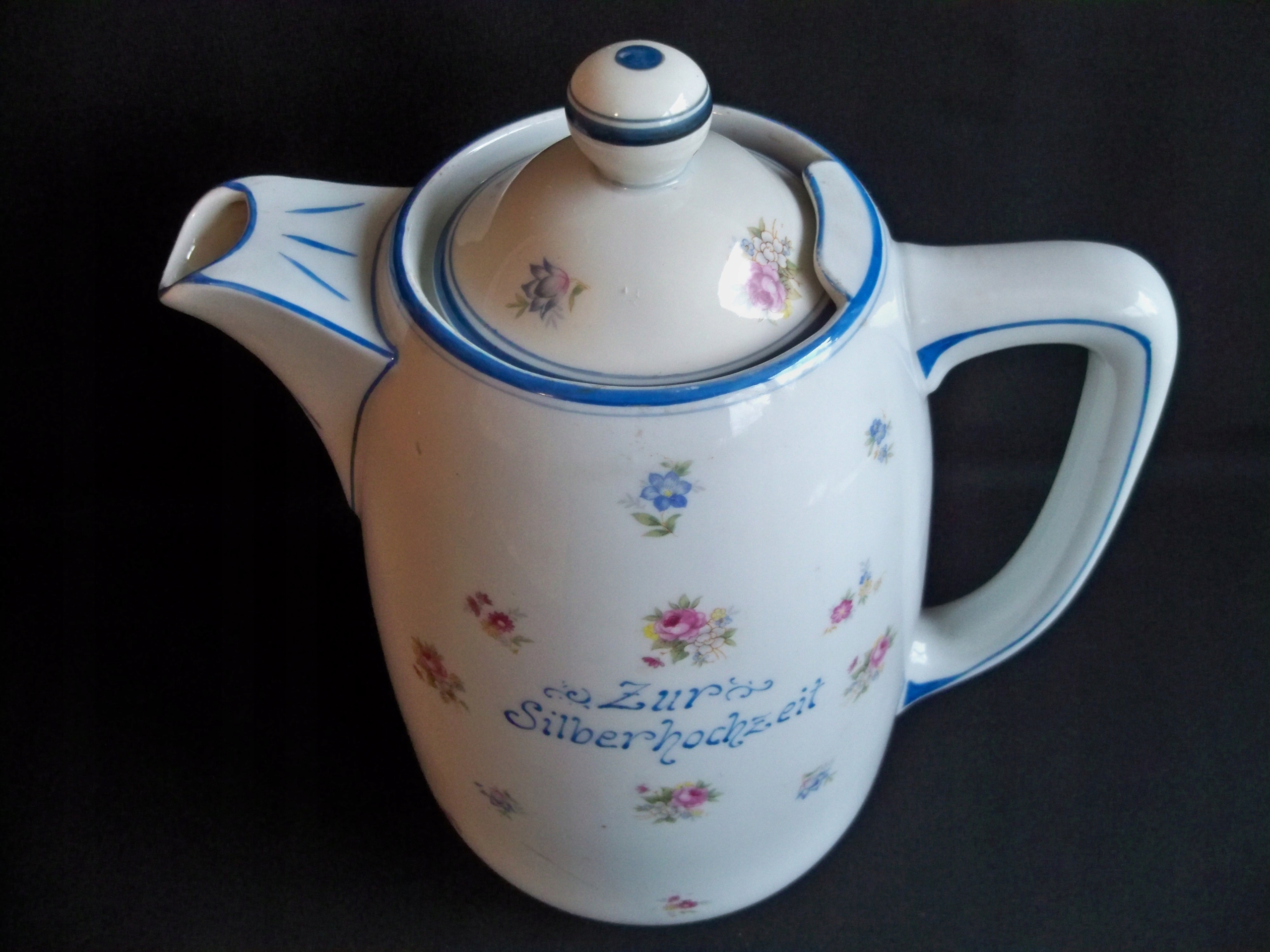 Старый, довоенный (подпись использовалась в 1930-45 гг.) памятный кувшин. Очень редкий экземпляр, с надписью "К серебряной годовщине свадьбы". Кувшин в хорошем состоянии, за исключением видимых на фотографиях естественных потертостей декора и мелких царапин. Учитывая, что кувшин пережил Вторую мировую войну и уже старый, его состояние оцениваю как очень хорошее. ;)