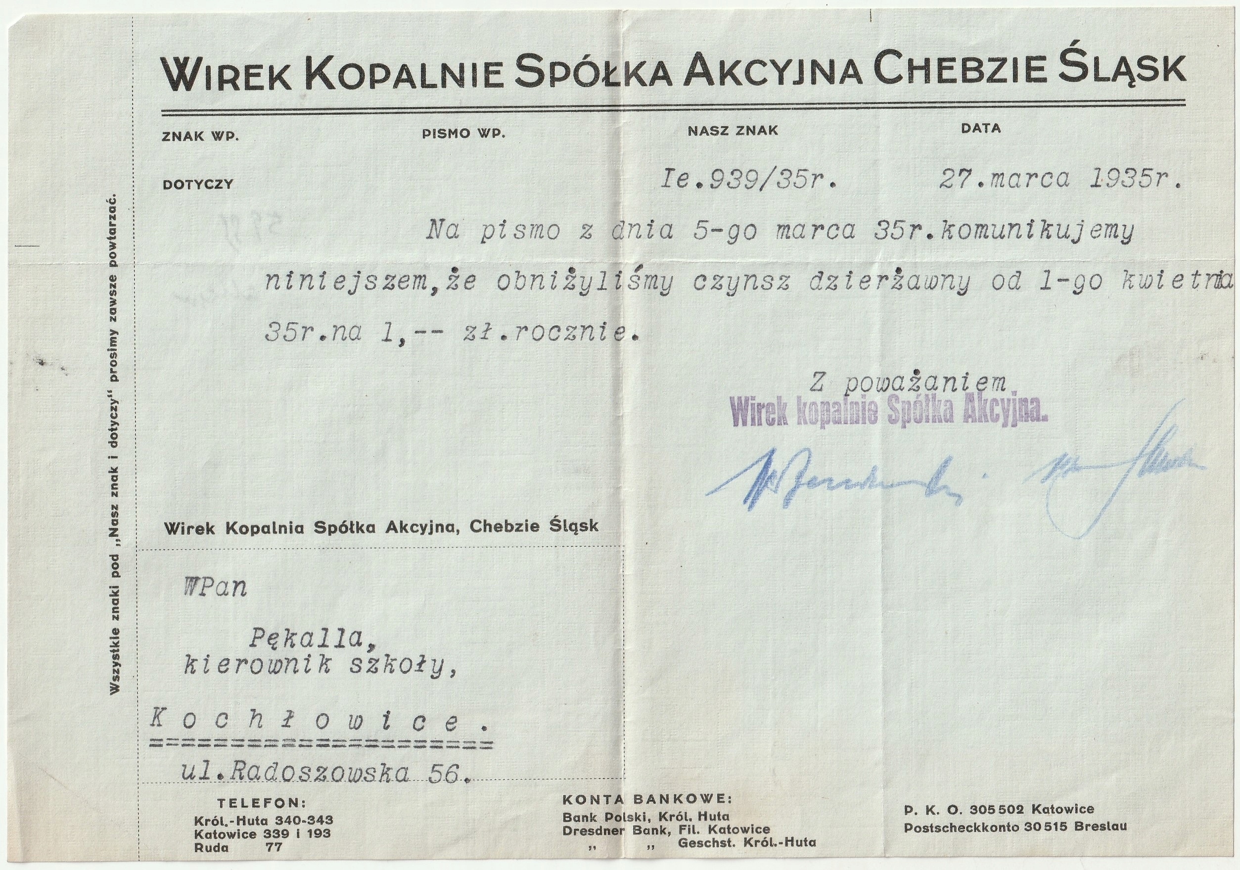 КОХЛОВИЧІ (СІЛЕЗЬКА РУДА). Лист від 1935, від Вірок Шахти Акціонерне товариство...