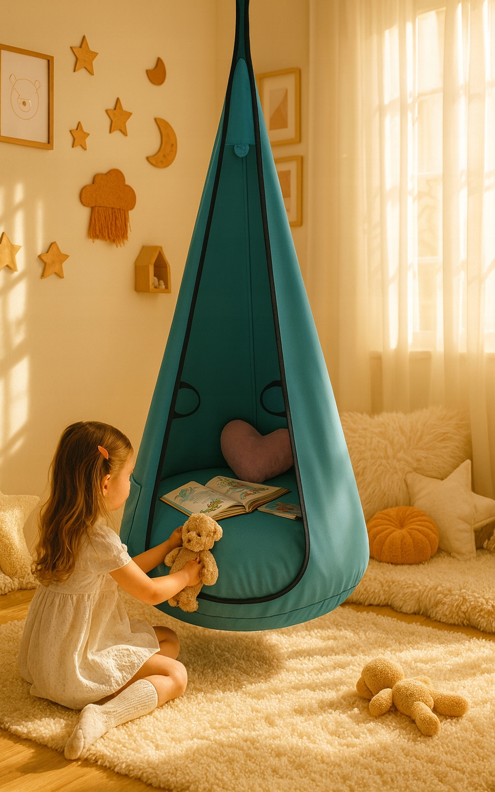 • Это место, где ребенок может сидеть, отдыхать, смотреть или читать книгу, отдыхать или даже засыпать. Нежное покачивание расслабляет, успокаивает и успокаивает чувства. В небольших пространствах это безопасный, тихий анклав, свое пространство, своеобразная зона отдыха.