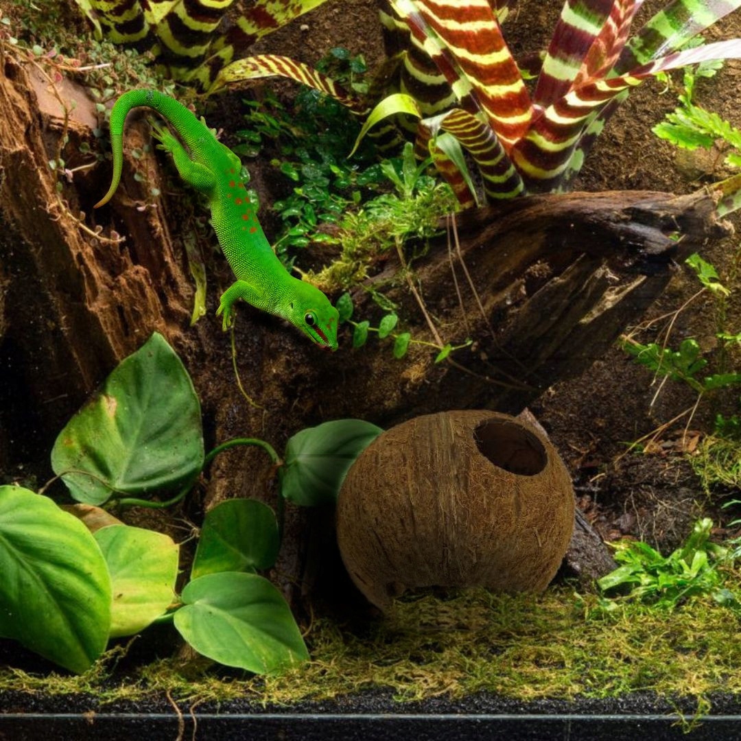 Представляем вам известный и популярный тайник в виде полой скорлупы кокосового ореха. В убежище есть 3 отверстия, служащие входом, что значительно облегчает животному его использование, а нам - чистку или удаление животного. Он хорошо подходит как для укрытия на земле, так и в верхних частях аквариума для древесных ящериц. Отличный вариант — сделать веревку и повесить ее.