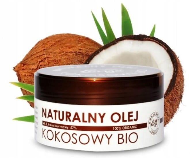 Он один из самые полезные и лучше всего усваиваемые жиры в мире. Холодного отжима его получают из свежесобранных орехов без предварительной сушки. В нем есть очень высокое содержание насыщенных жирных кислот, особенно лауриновая кислота (ок. 50-57%), миристиновая кислота, каприловая кислота, каприновая кислота, пальмитиновая кислота, олеиновая кислота, стеариновая кислота, линолевая кислота и кислота капроновый. Помимо насыщенных кислот обогащен витамином Е и С. Прессованный холодное, это натуральное масло с красивым, мягким запахом кокса. Быстрый впитывается в кожу, успокаивает и охлаждает, так что это здорово хорошо действует после принятия солнечных ванн, принося облегчение. Кожа становится блестящей коричневый цвет, приятный тропический аромат, становится гладким и мягким. Его увлажняющие и смазывающие свойства идеально подходят для кожи. сухая, растрескивающаяся, чувствительная и зрелая. При температуре ниже 25 °C становится белым. творожистый жир, также называемый кокосовым маслом. Имеет цвет в жидкой форме. слегка золотистый.