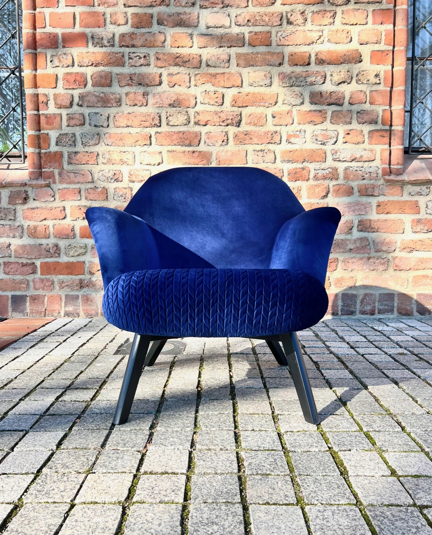 Студия Fotelownia рекомендует к продаже кресло ковшового типа на основе фанерного каркаса на деревянной Х-образной ножке, слегка наклоненное назад. Кресло можно использовать как стульчик для кормления и прекрасно впишется в интерьер гостиной, спальни или общественных помещений, например, кафе, бутика, студии, офиса, салона красоты.