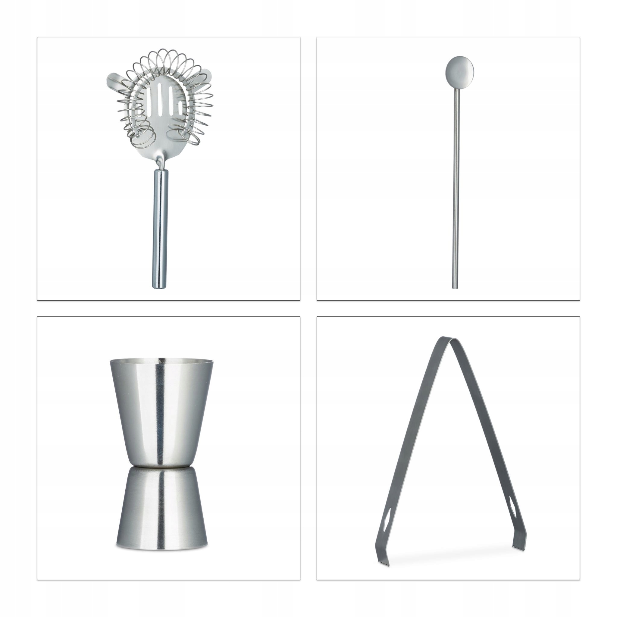✅ Полный набор 5 в 1 — шейкер, двойной мерный стакан, ситечко, щипцы и барная ложка.