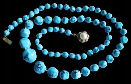 Аукционный предмет представляет собой ожерелье, видимое на фото. Он был привезен из Германии - купленного на Trodelhalle с украшениями. Сделано из бирюзовых бус, но я не знаю, является ли это камнем или стеклом. Целое холодно на ощупь и имеет свой вес. Декоративная застежка. Состояние, как на фото.