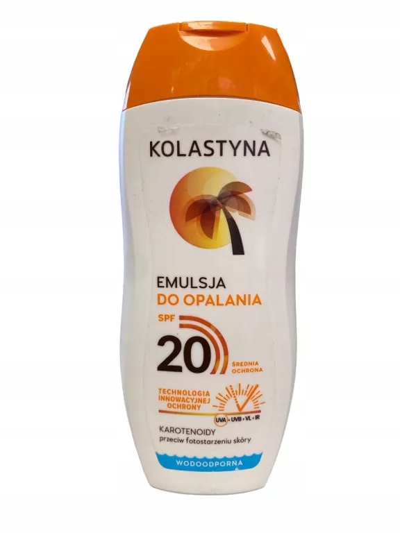 - KOLASTYNA SUN EMULSION SPF 20 обеспечивает эффективную и фотостабильную защиту от 4 основных типов излучений (UVA, UVB, видимый свет, инфракрасное излучение), которые способствуют солнечным ожогам и образованию свободных радикалов, ответственных за преждевременное старение и фотостарение кожи. Каротиноиды, содержащиеся в формуле, натуральные и сильные антиоксиданты, помогают стимулировать собственную защитную систему кожи, обеспечивают уход и защиту от фотостарения, а также здоровый, молодой вид.