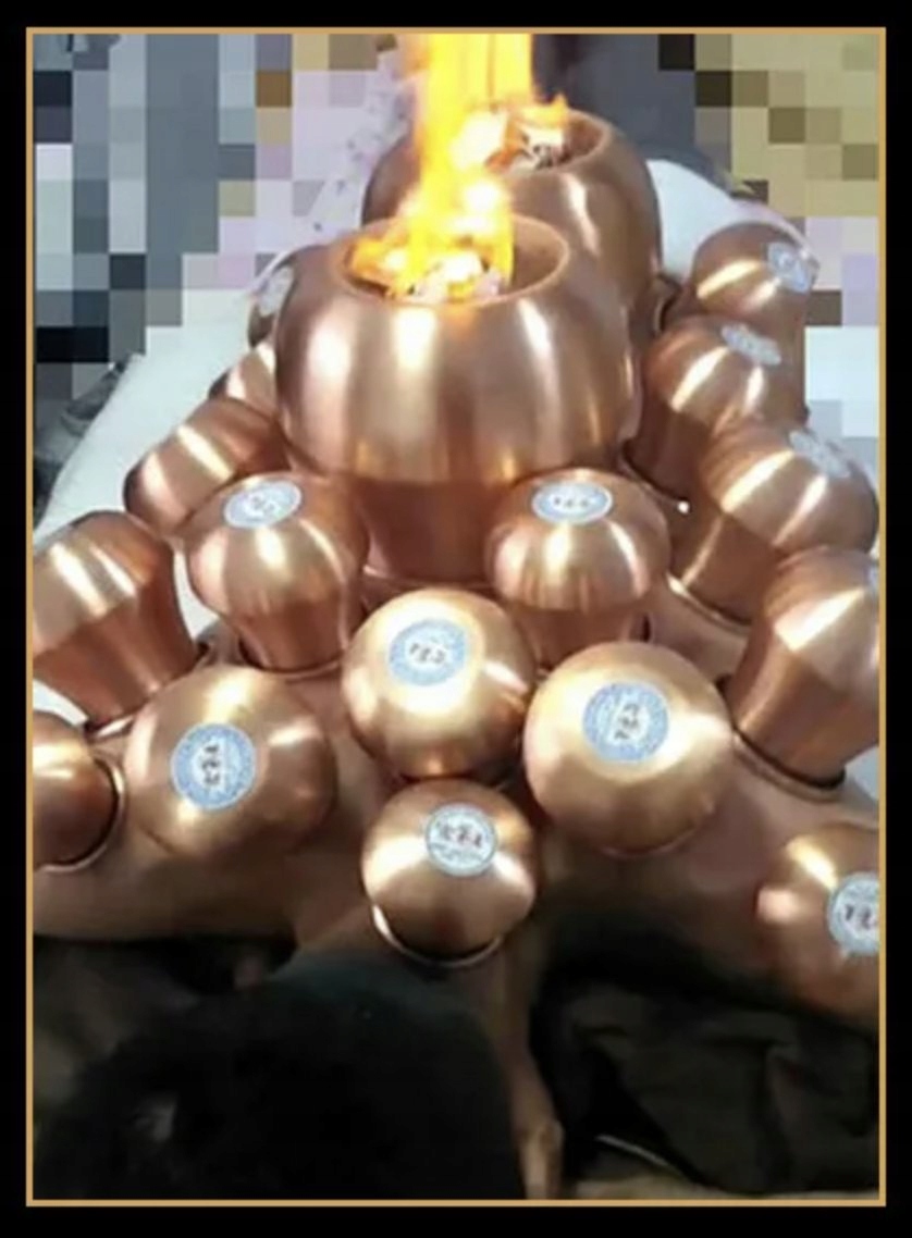 Медная колба — это изделие, которое размещается так же, как классическая стеклянная колба — с используя огонь, нагревая его внутреннюю часть непосредственно перед нанесением на кожу. Чаши для банок традиционно размещаются на спине, но при лечении традиционной китайской медициной их также можно ставить на точки акупунктуры.
