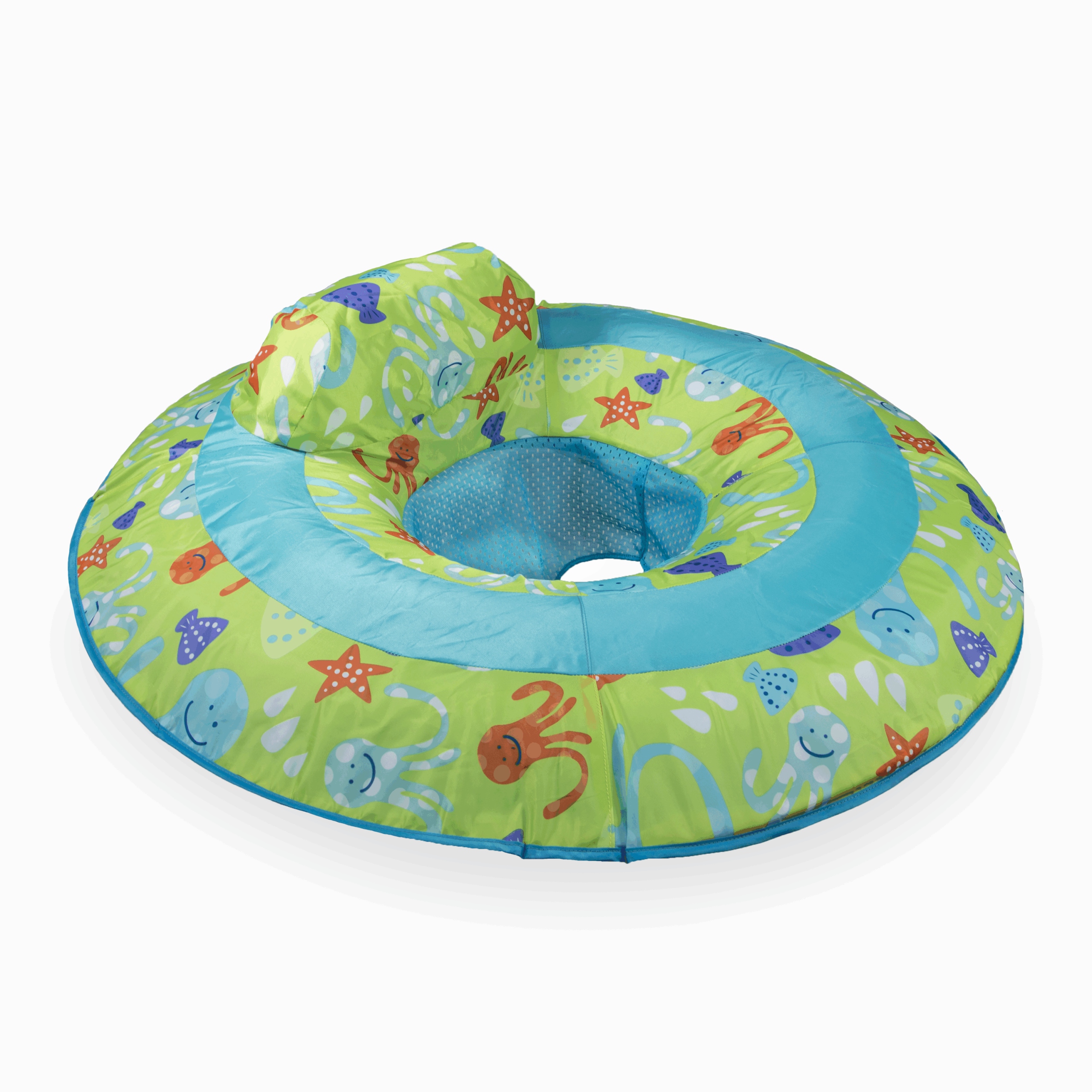 Кольцо SwimWays Baby Springfloat произведено компанией Spin Master, известной своей высококачественной продукцией. Понтон имеет сиденье из сетки с отверстиями для ног и спинку, которая обеспечит комфорт ребенка. Он зеленого и оранжевого цвета и имеет изображения, связанные с морскими существами. Кроме того, в комплект входит шляпа для защиты от солнца.