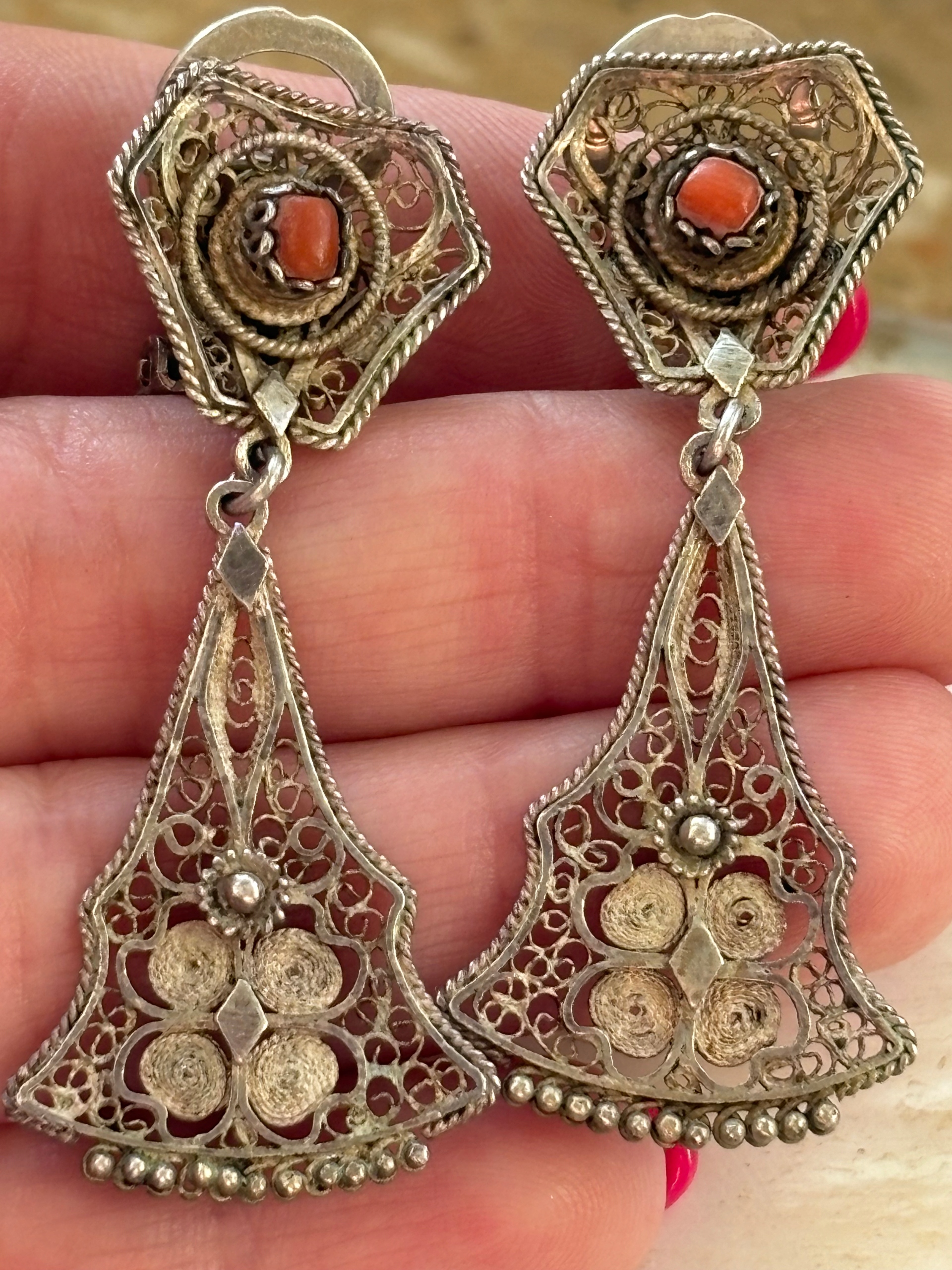 Kolczyki klipsy stare srebrne wiszące filigran ruchome Koral naturalny