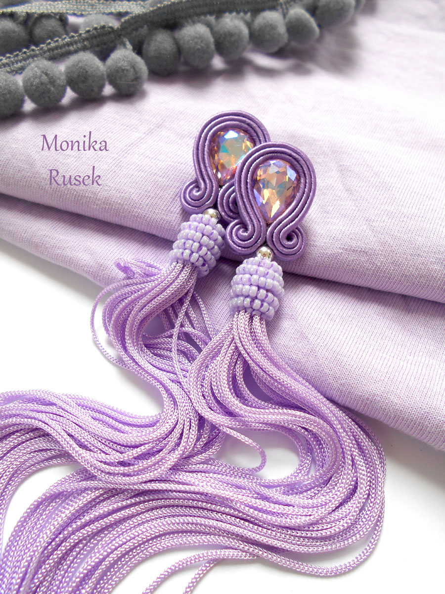 KOLCZYKI SUTASZ smukłe frędzle hand made lawendowe