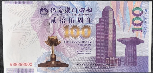 Рад предложить Вам уникальную коллекционную банкноту номиналом 100 патак, выпущенную по случаю 25-летия возвращения Макао Китаю. Это необыкновенный исторический сувенир и удовольствие для каждого нумизмата.