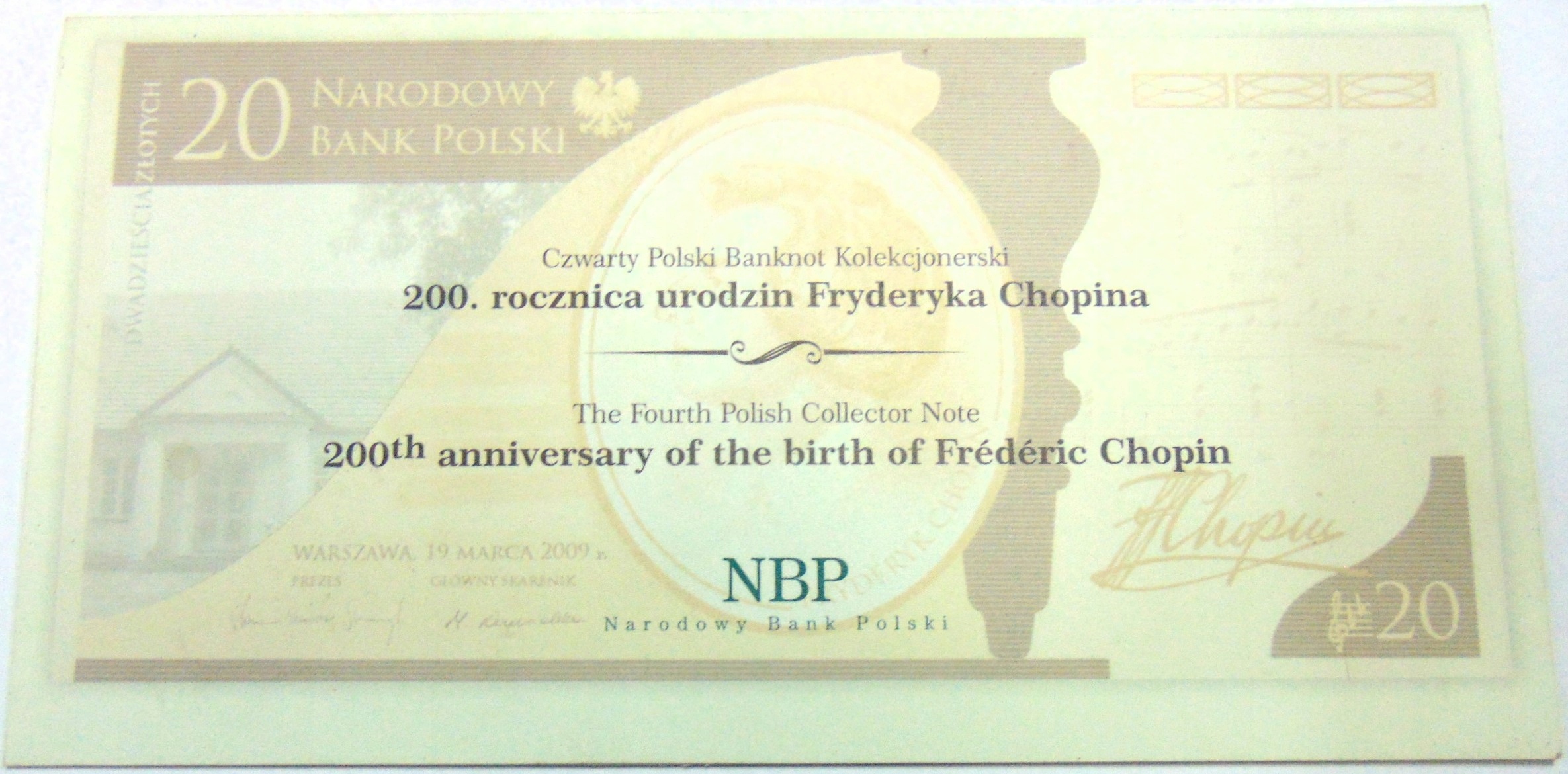 Коллекционная банкнота НБП номиналом 20 злотых 2009 г. Фредерик Шопен (№ 1)