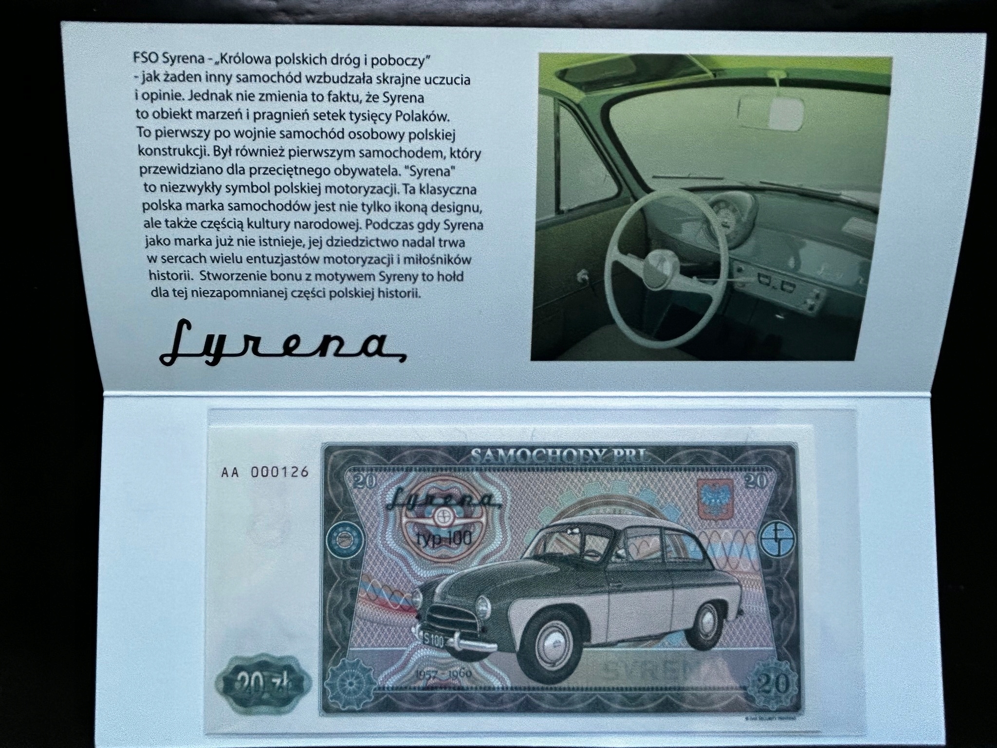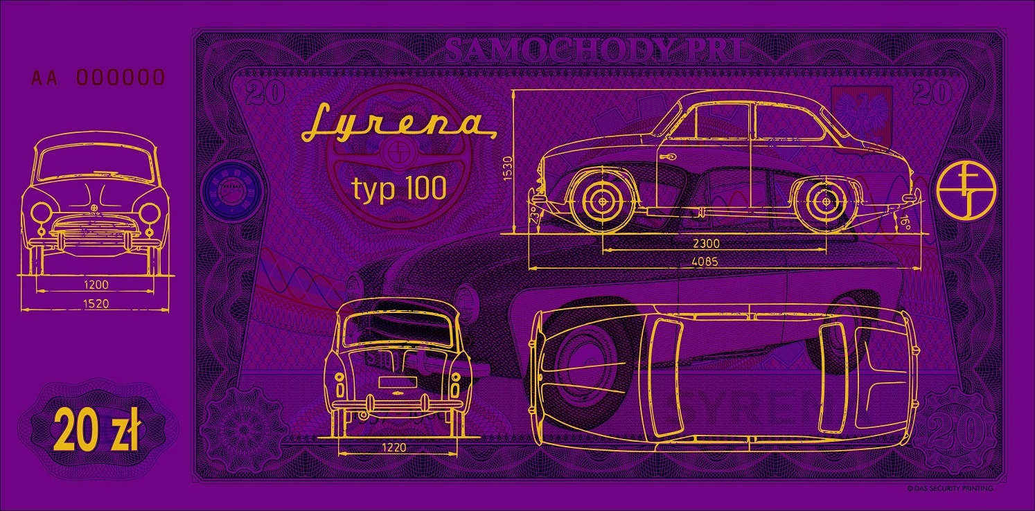 Гильошированный фон, геометрический, растровый орнамент. Слева вверху на белом поле серия и цифра - красного цвета с тем же размером шрифта, две буквы и шесть цифр. Внизу, в декоративной розетке, номинал: 20 злотых. В прямоугольнике вверху надпись, название серии: CARS PRL. С левой стороны расположены часы спидометра. Справа ректо-версальный элемент в виде логотипа производителя. В правом верхнем и нижнем углах номинал: 20. В левом нижнем углу повторяющаяся цифра/номинал «20» в виде круга. В центре изображение легкового автомобиля ФСО Сирена 100 с табличкой с надписью «С 100». Над автомобилем, с правой стороны, герб Польской Народной Республики (ПРЛ). Слева - руль Сирены со стилизованным названием, используемым на автомобилях, и номером модели: Сирена / тип 100. Под изображением Сирены слева годы выпуска: 1957 - 1960. Справа - название автомобиля, стилизованное (?) под скрытый образ: СИРЕНА. В белом поле под рамкой справа название типографии, перед которым стоит знак авторского права: © DAS SECURITY PRINTING.