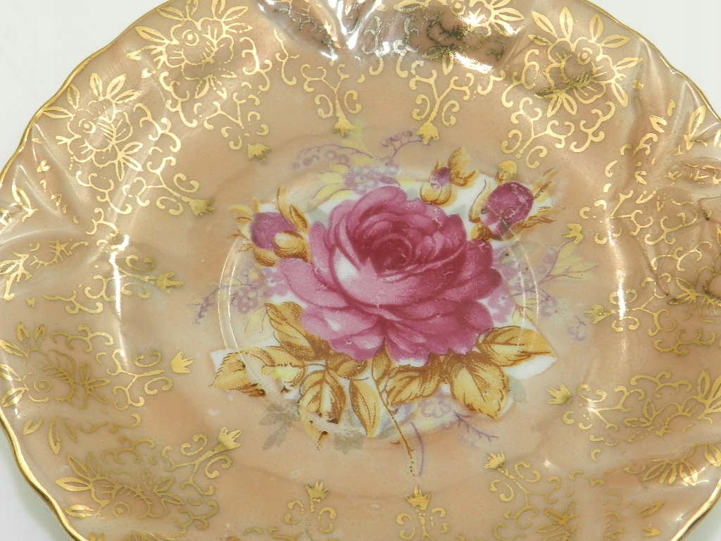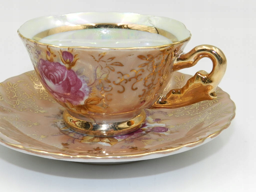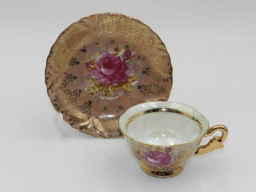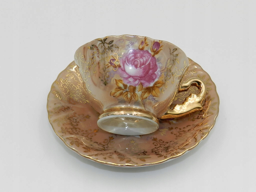 На зеркале блюдца и на чашке орнамент в виде форма красивой розы, прекрасно раскрашенной и выполненной с вниманием к мельчайшим деталям.