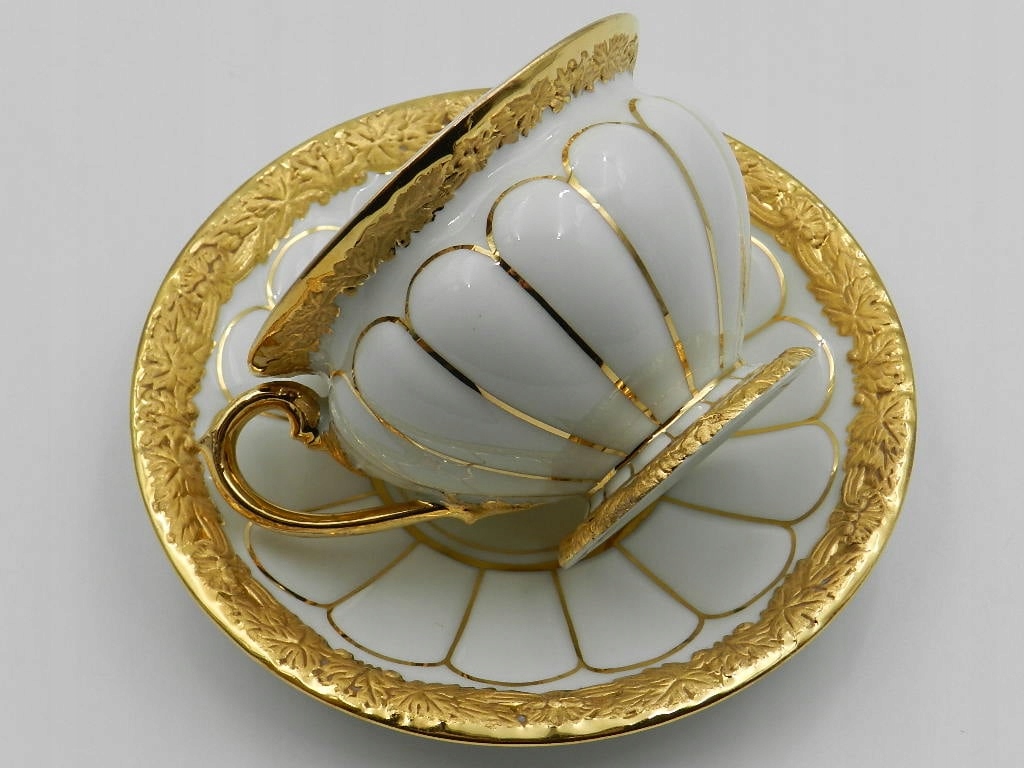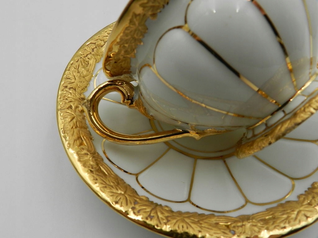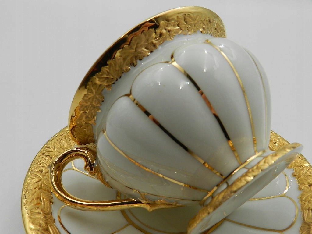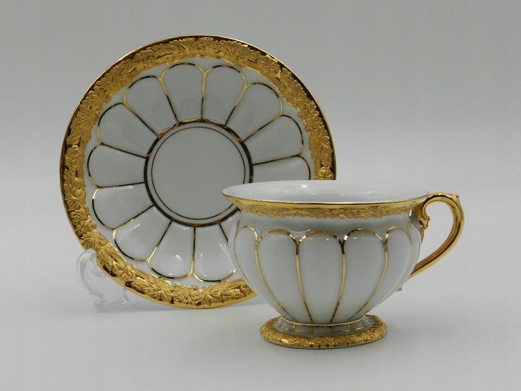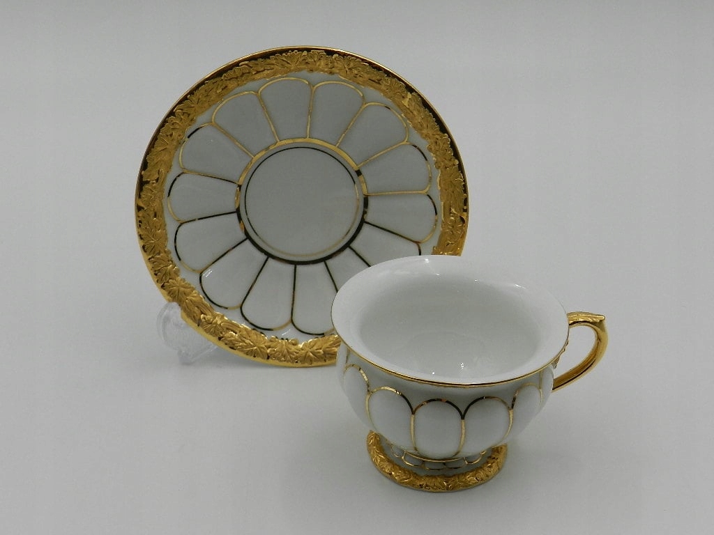 Особого внимания заслуживают края экспоната, как на чашке, так и на блюдце, прекрасно украшенные рельефами и тиснением в виде нежных листьев, покрытых с 24-каратным золотом.