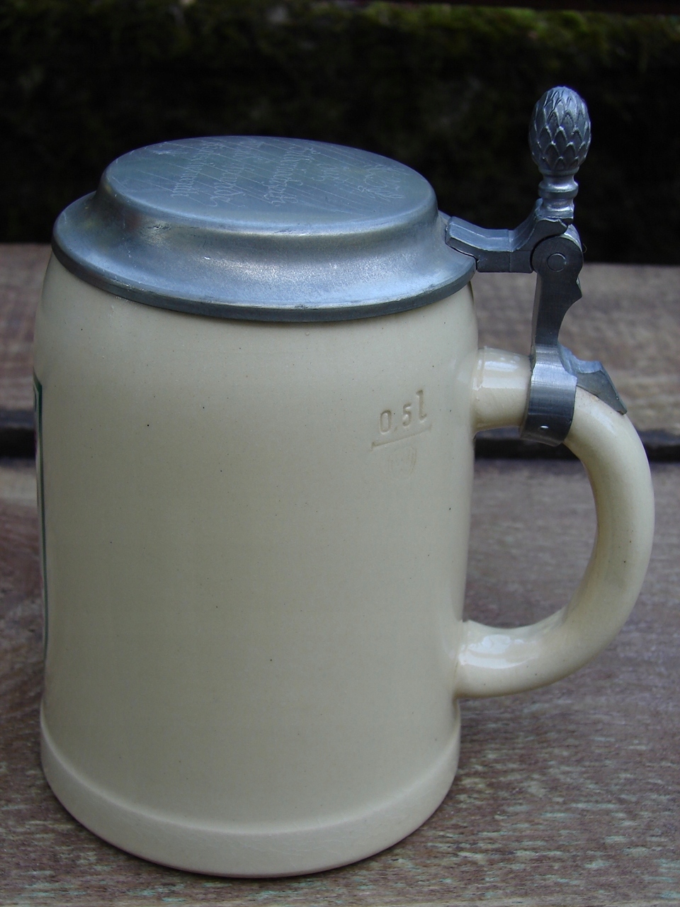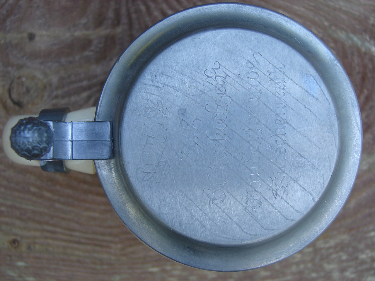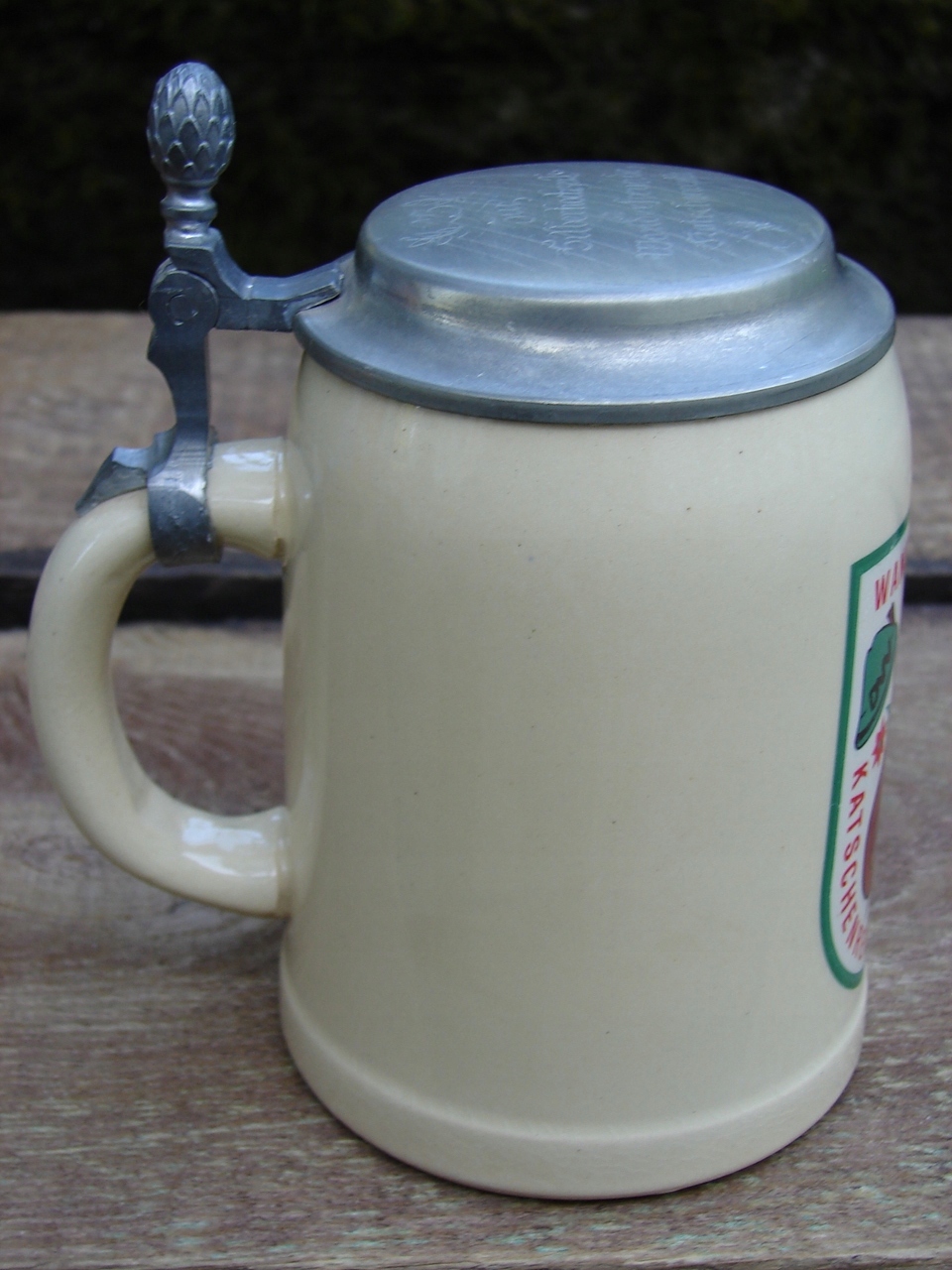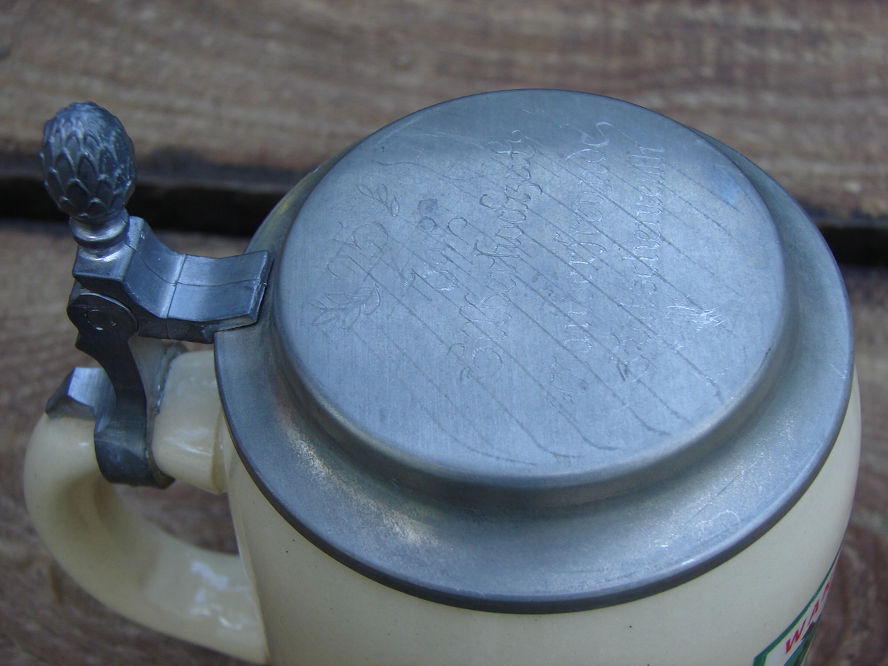 Кружка без трещин, жестяная крышка прекрасной сохранности, с местным налетом патины. пятна, царапины.