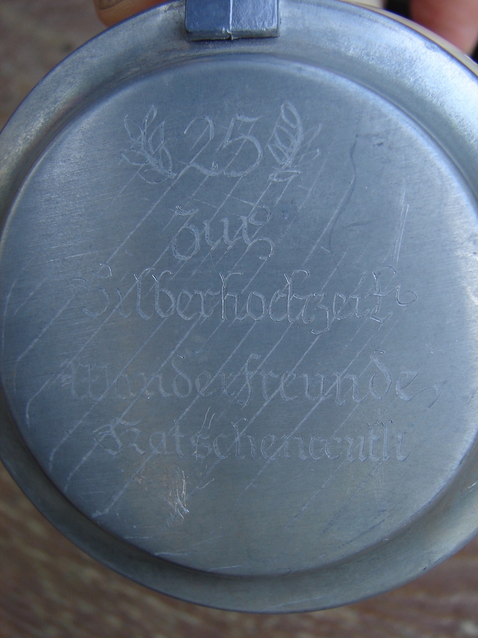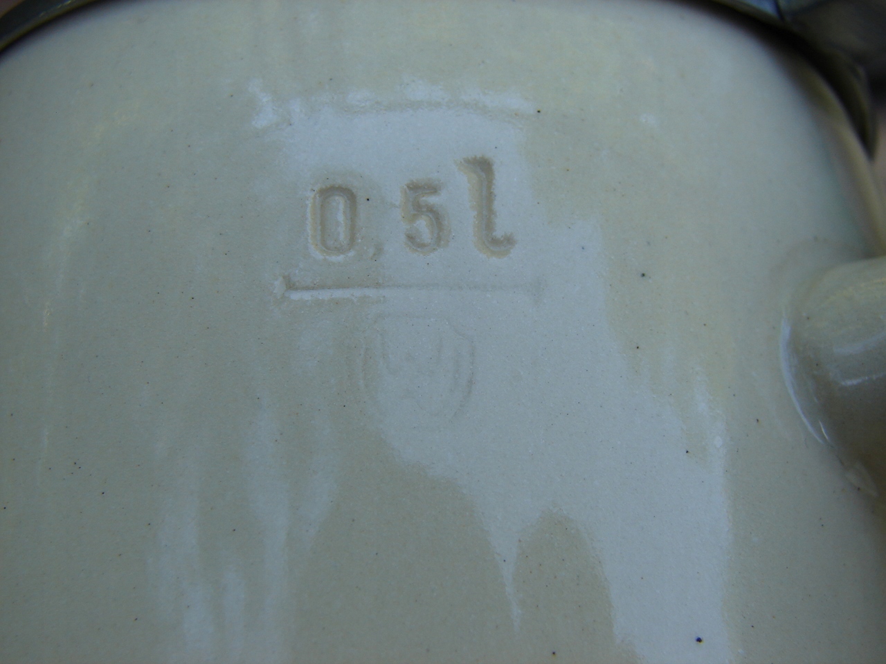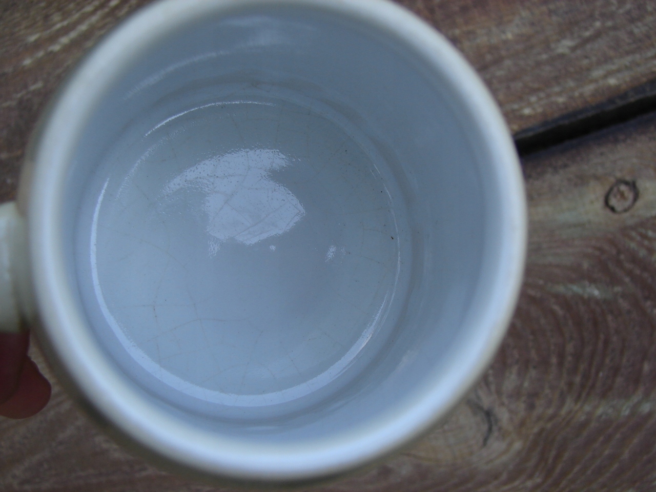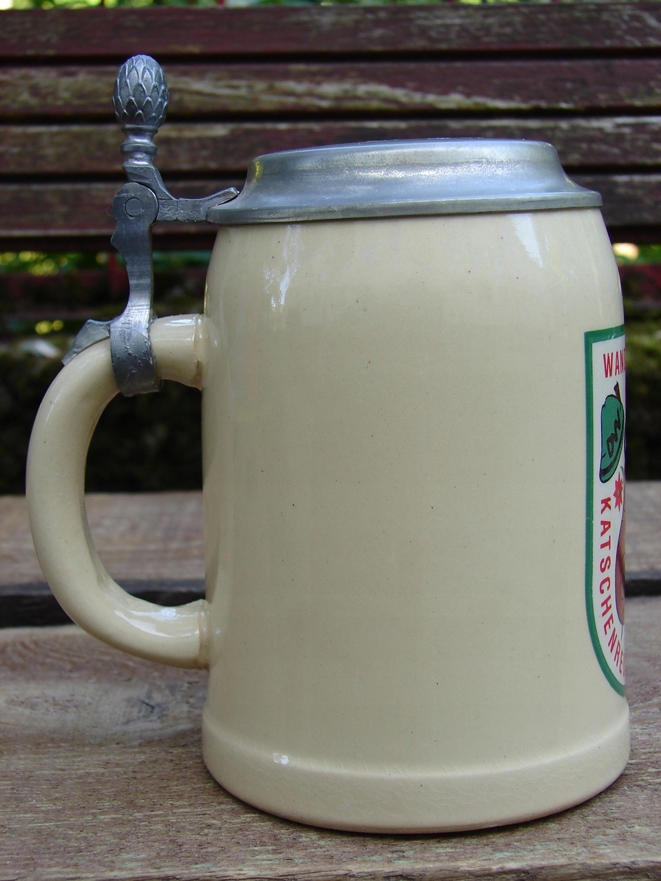 Кружка без трещин, жестяная крышка прекрасной сохранности, с местным налетом патины. пятна, царапины.