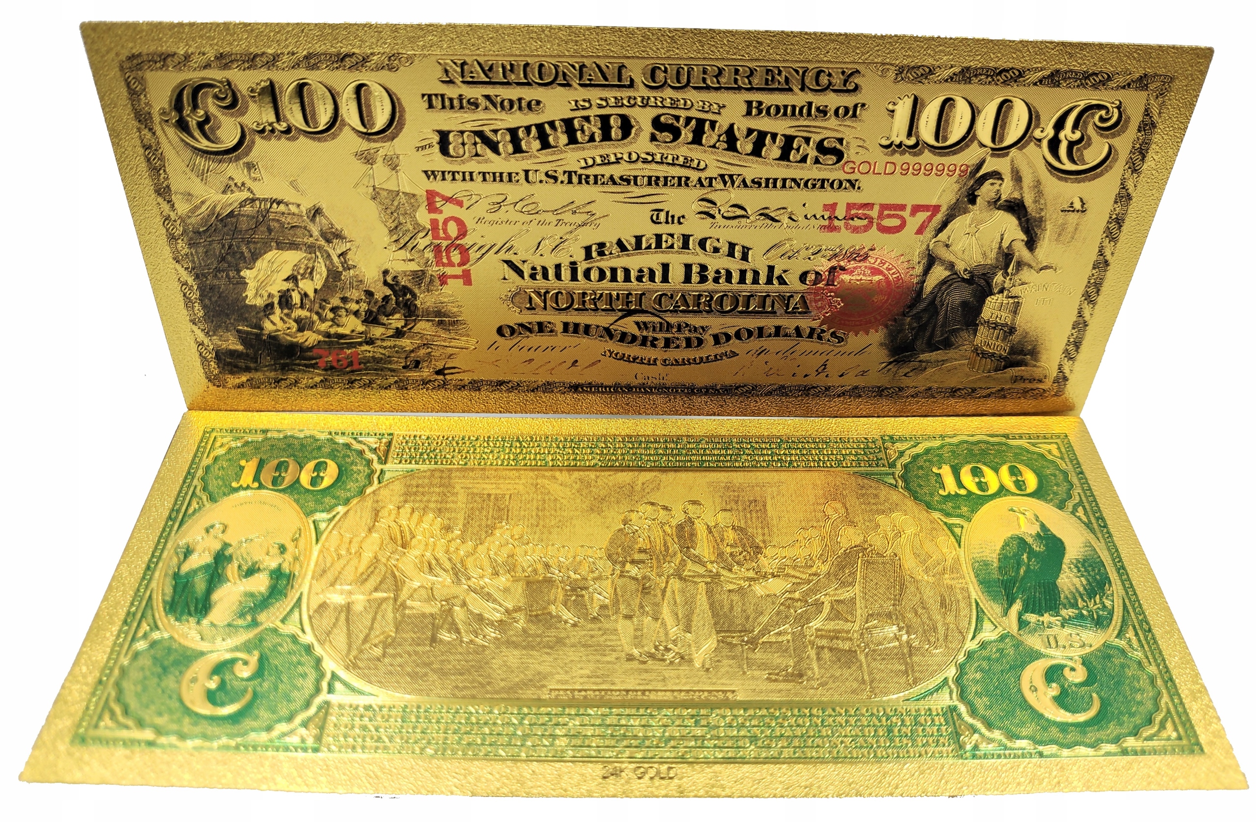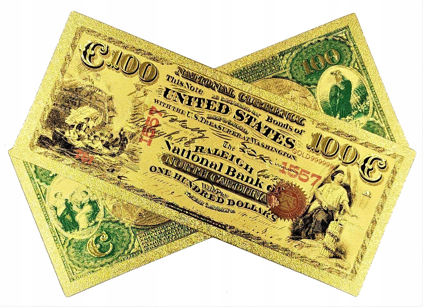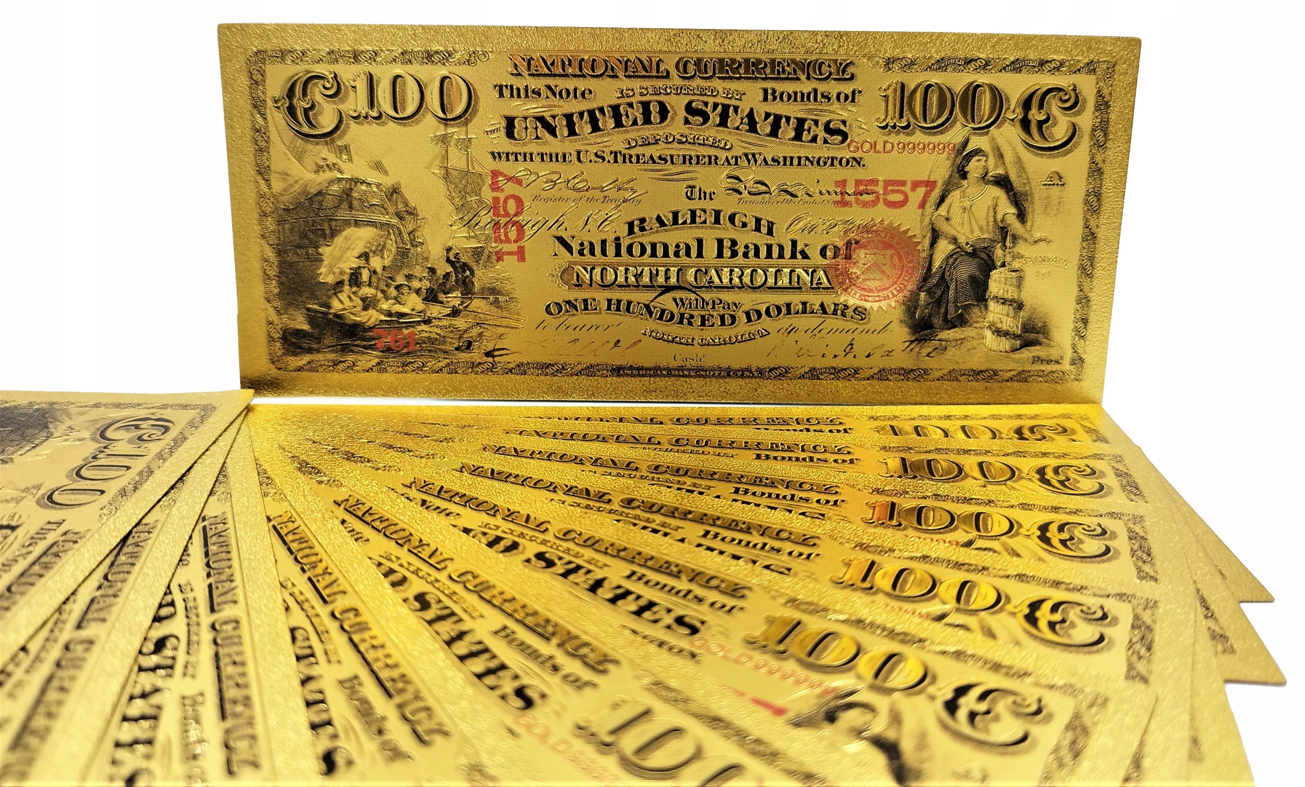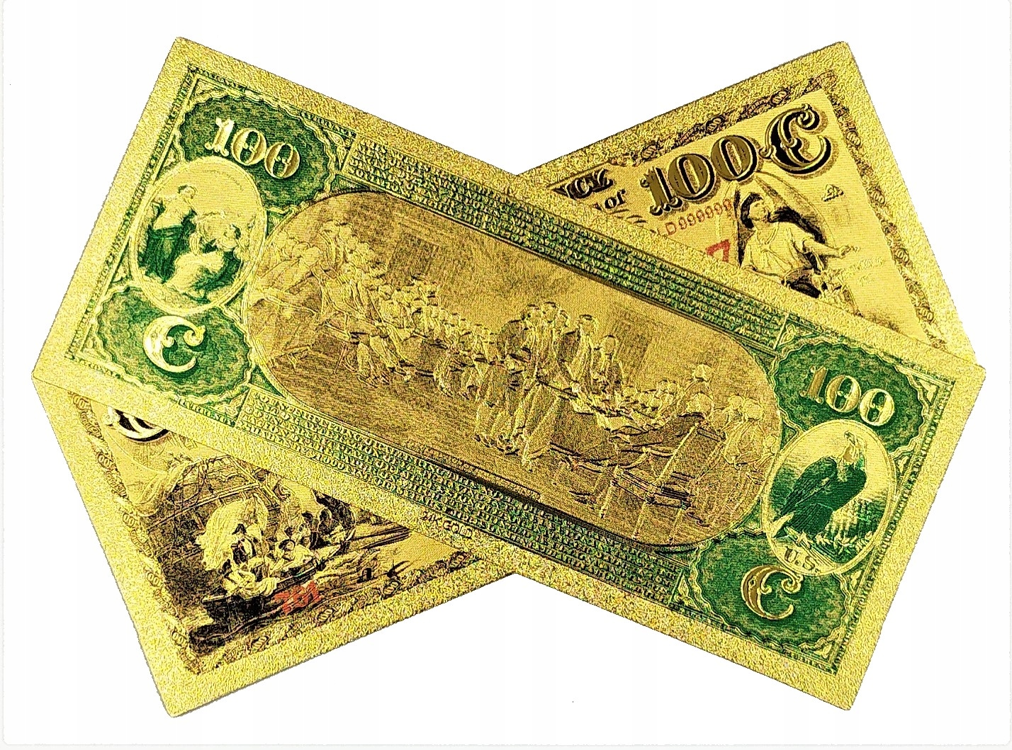 Точная копия американской банкноты первой серии 1875 года, изготовленная из ПВХ и покрыта золотой фольгой.