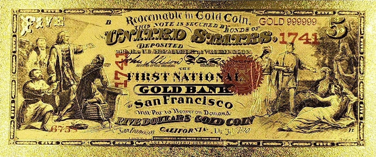 Позолоченная коллекционная банкнота в пять долларов 1875 года