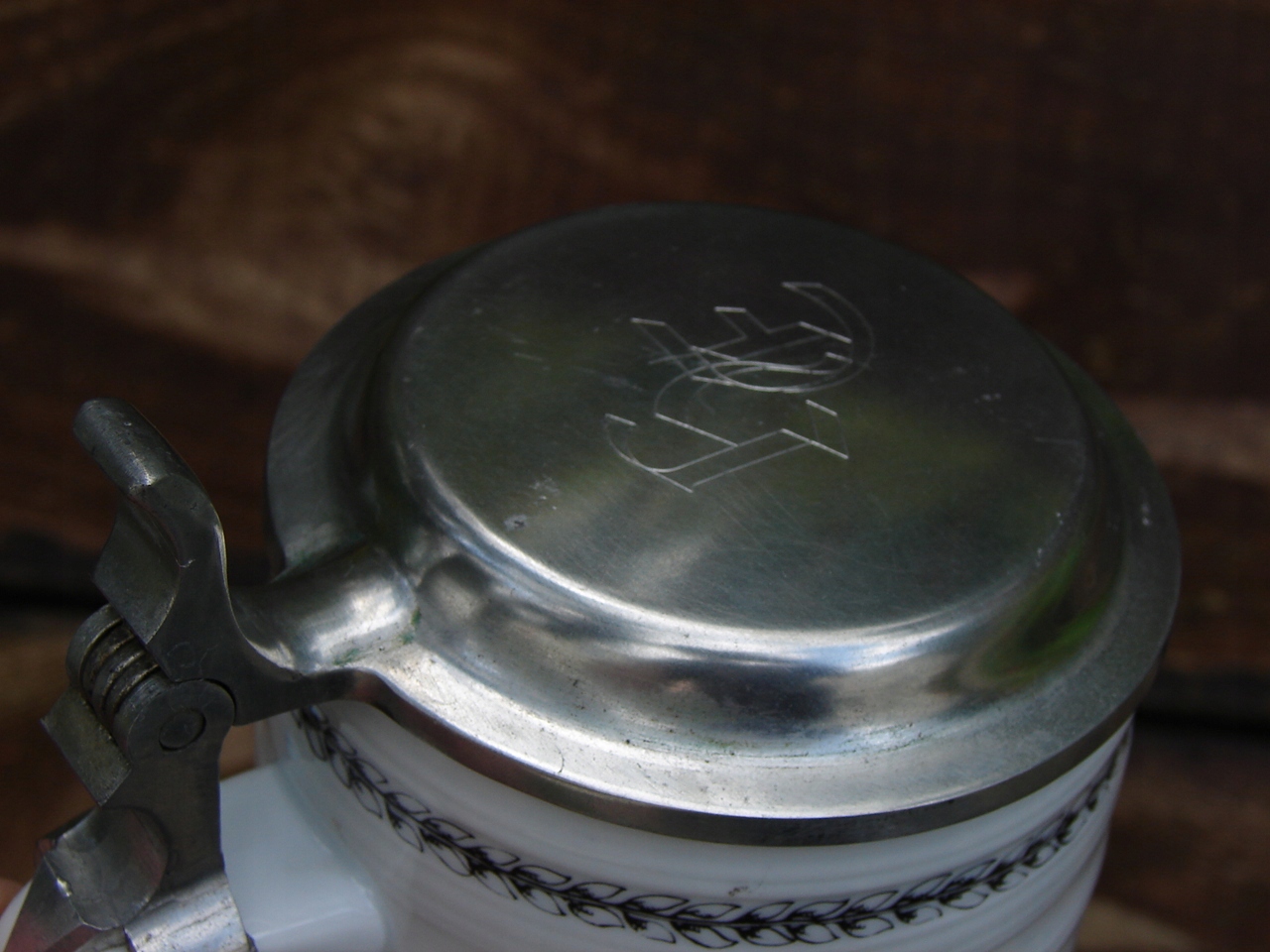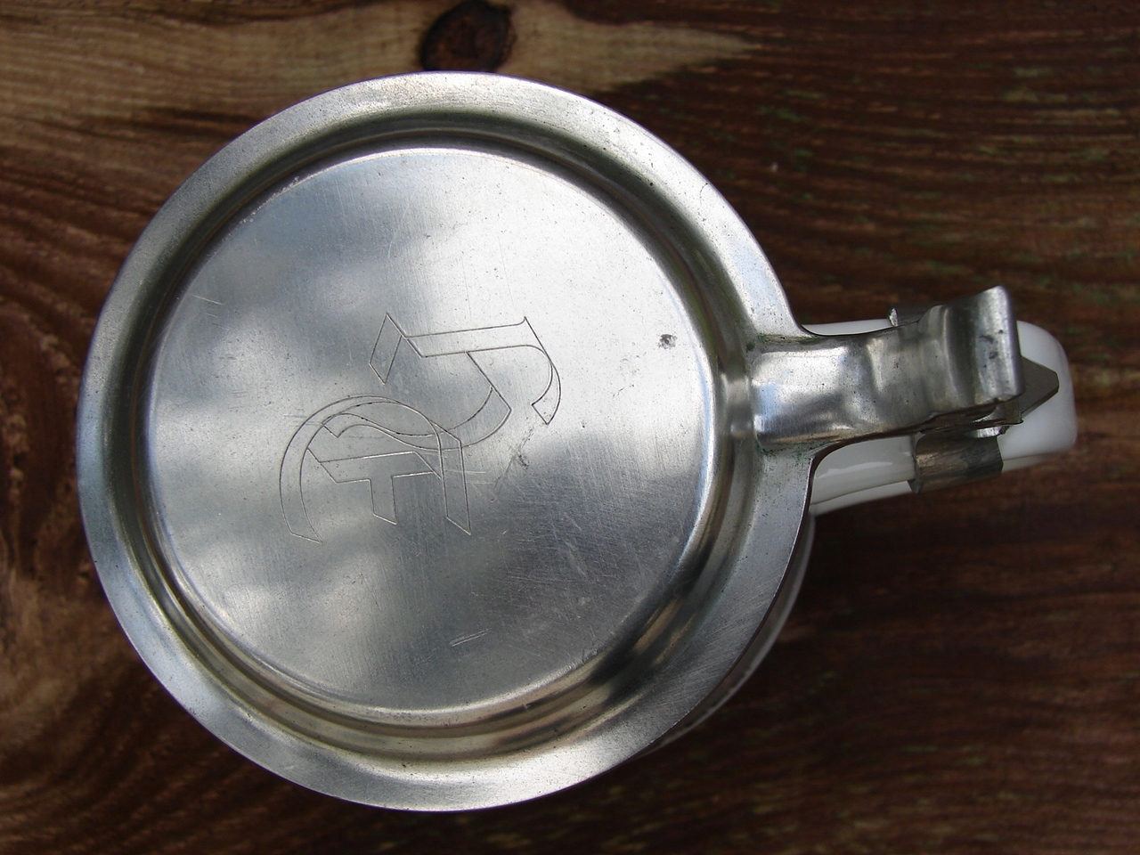 Кружка без трещин, жестяная крышка прекрасной сохранности, с патиной и локальными пятнами. царапины.