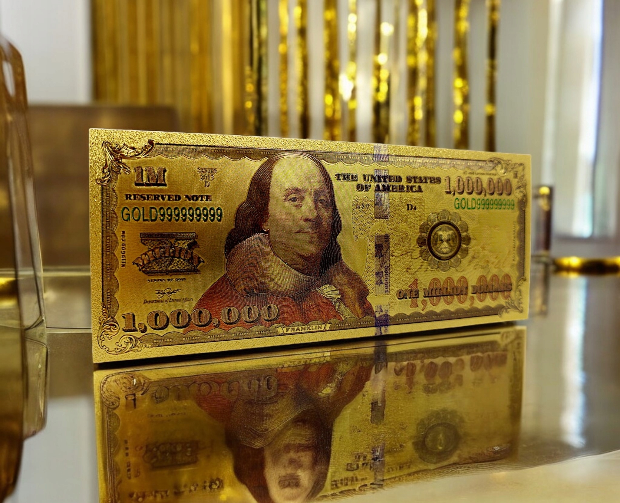 Красивая позолоченная коллекционная банкнота номиналом один миллион долларов.