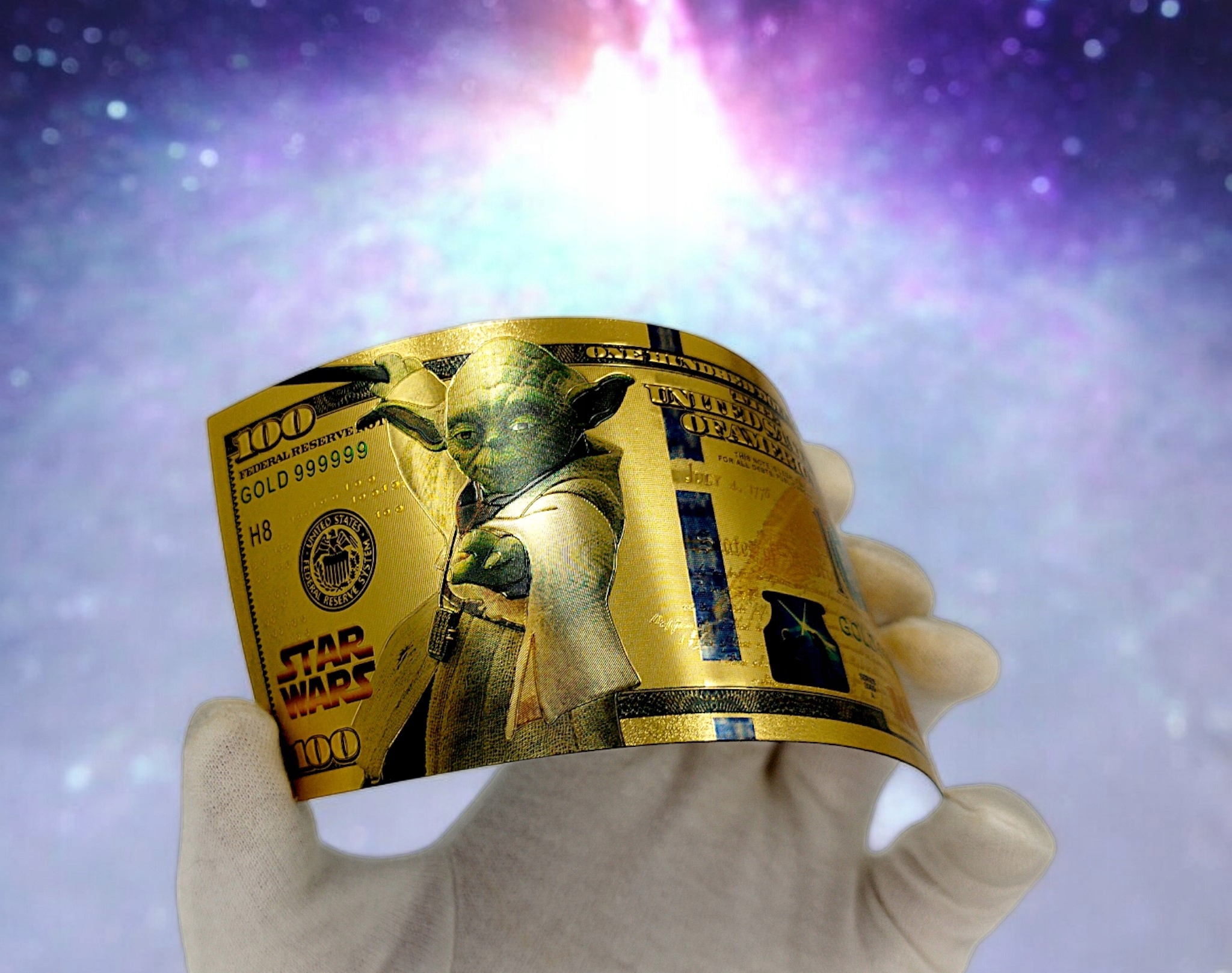 Красивая позолоченная коллекционная банкнота стоимостью 100 долларов с изображением Йоды из фильма Звездные войны.